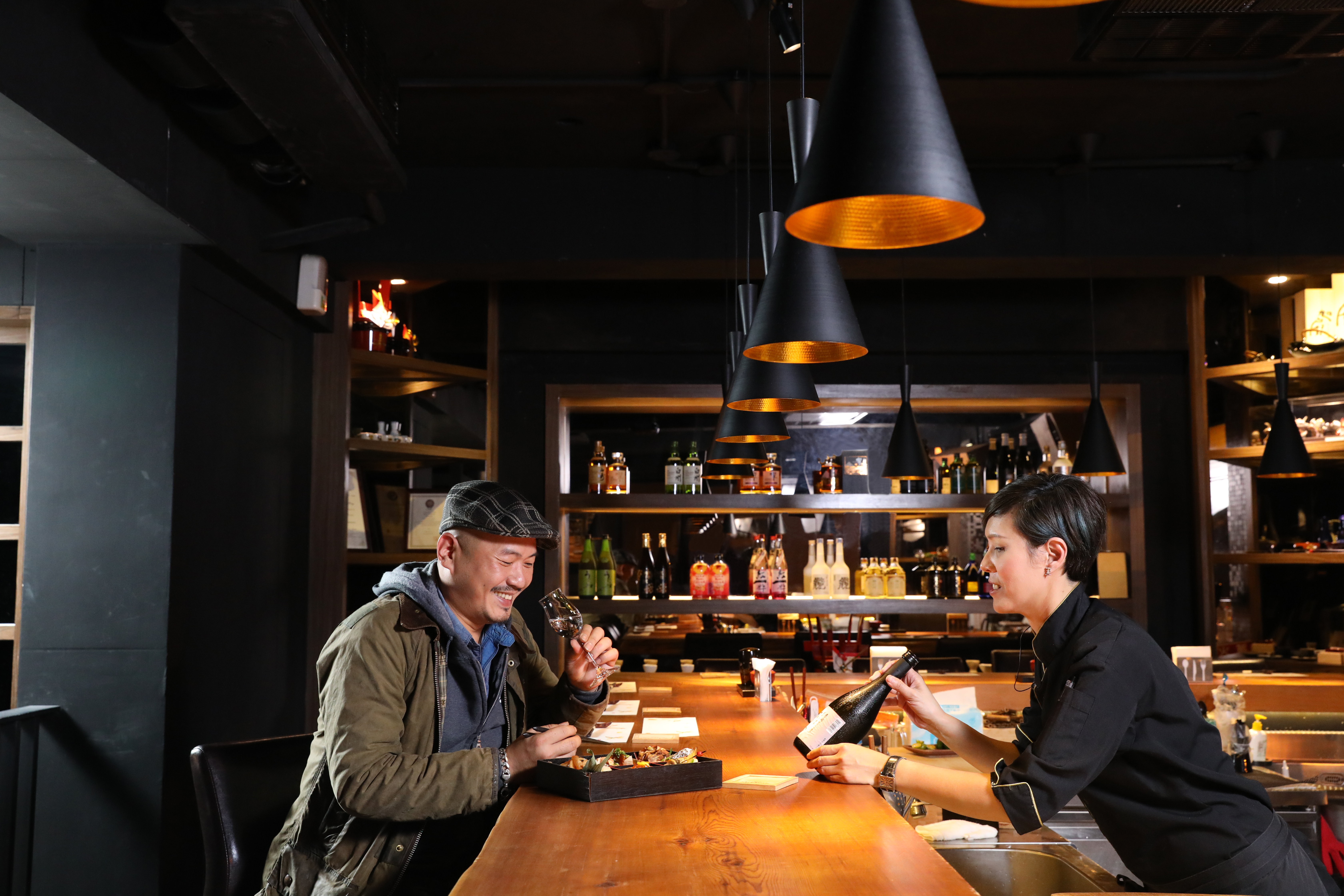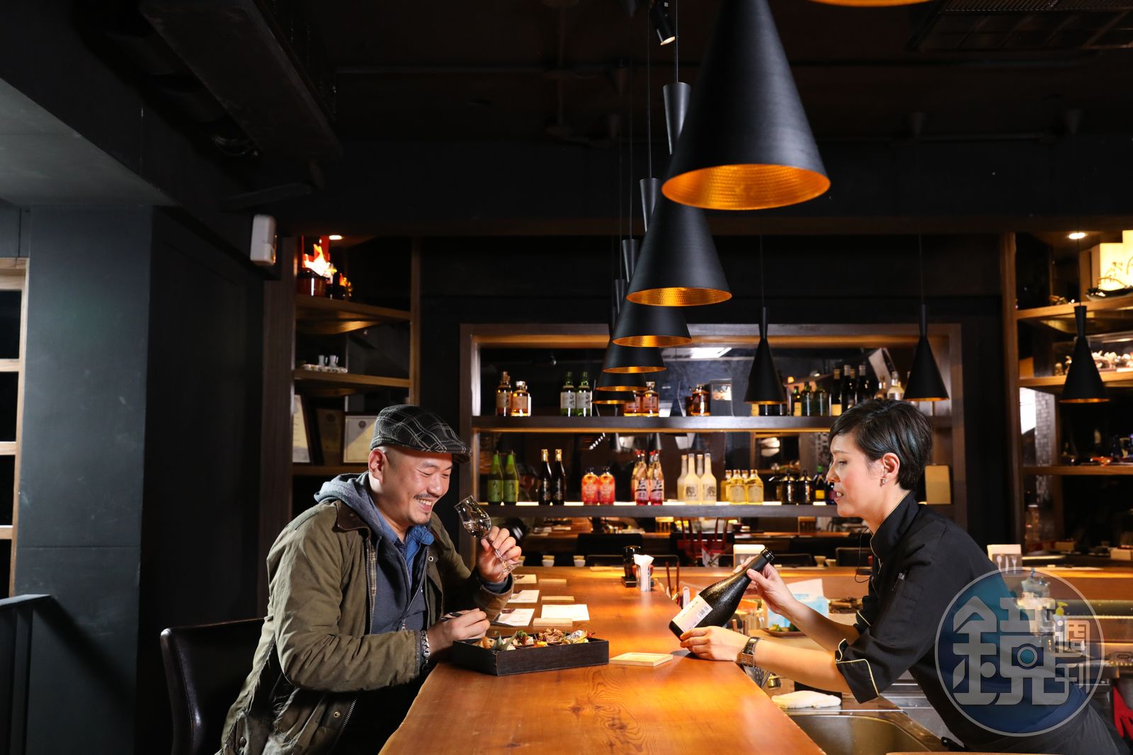 但今天我們先不到窩台北朝聖,反而纏著小T帶我們去他的私房餐館看眼界。第一站,來到了店門超低調、隱身2樓的「 先酒肴 」,這家專賣岩手縣清酒與日式酒餚的小店,推開門別有洞天,坐在吧台便可見敦化大道林蔭美景,這裡是小T很喜歡的位置。