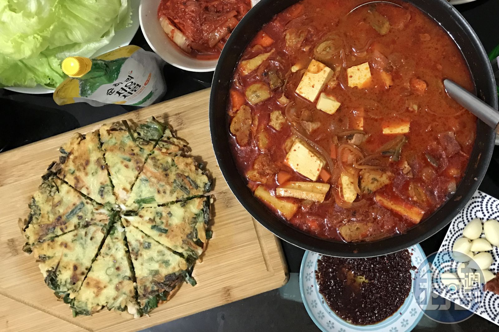 想豪華一點,可把蔥換成韭菜,冰箱冷凍庫裡的蝦仁、墨魚拿出來粗切丟進麵糊,再刨些胡蘿蔔絲配色,就是外頭韓國館子裡賣的海鮮煎餅了,沾醬也很簡單,韓國辣椒粉和醬油一比一,再滴個幾滴麻油拌勻就是了。更可用泡菜汁取代冰水調麵糊,煎出來粉紅粉紅的,配上火紅的泡菜鍋物,騙讚效果一百分喔。