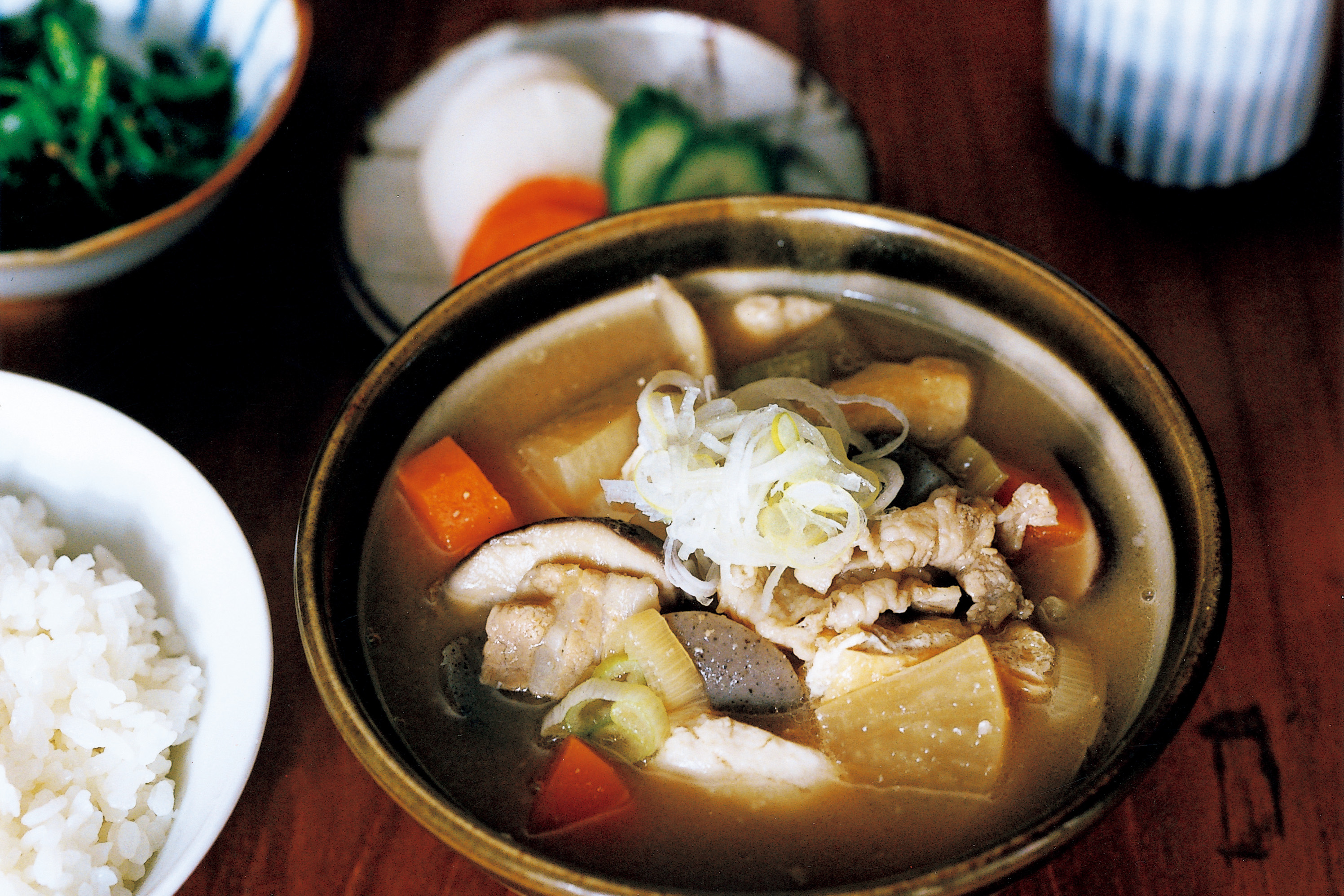 在電視劇的拍攝現場,飾演老闆的小林薰先生針對食物的烹調方式,時不時就會提議:「男子漢大丈夫,豪邁地做吧!」豬肉味噌湯就是其中之一。關鍵是將蔬菜切成大塊,蒟蒻和豆腐則用手剝開。