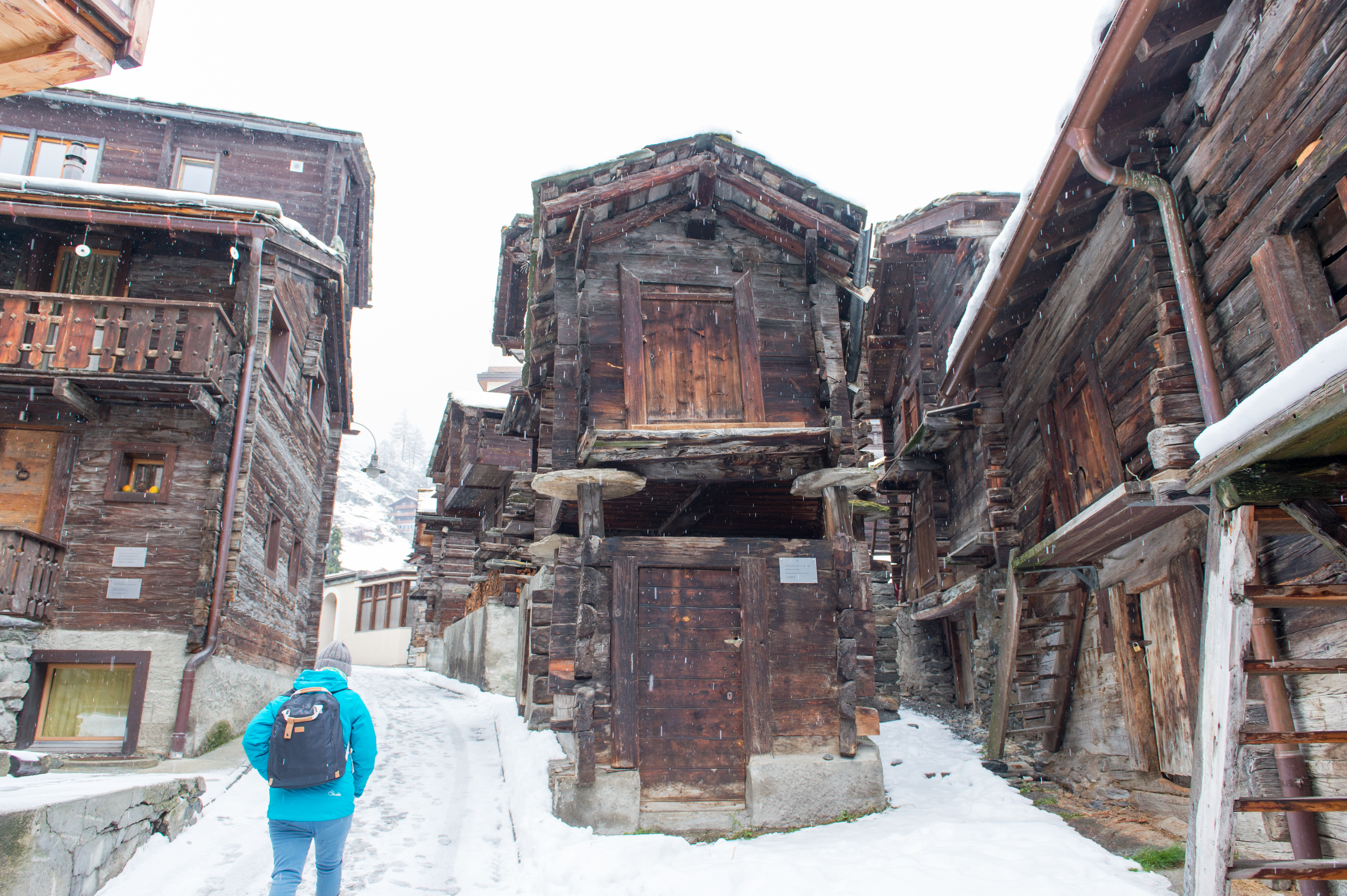 為了拍策馬特,我們走進舊建築遺跡新特朵夫老屋區,此時開始下起大雪,我們緩步走進遺跡的街道,周圍完全安靜,「你仔細聽,雪地有一種聲音。」小明哥一邊說,我倆安靜下來,果然聽見白雪灑在木頭建築上,小小聲濺起了答答聲響。