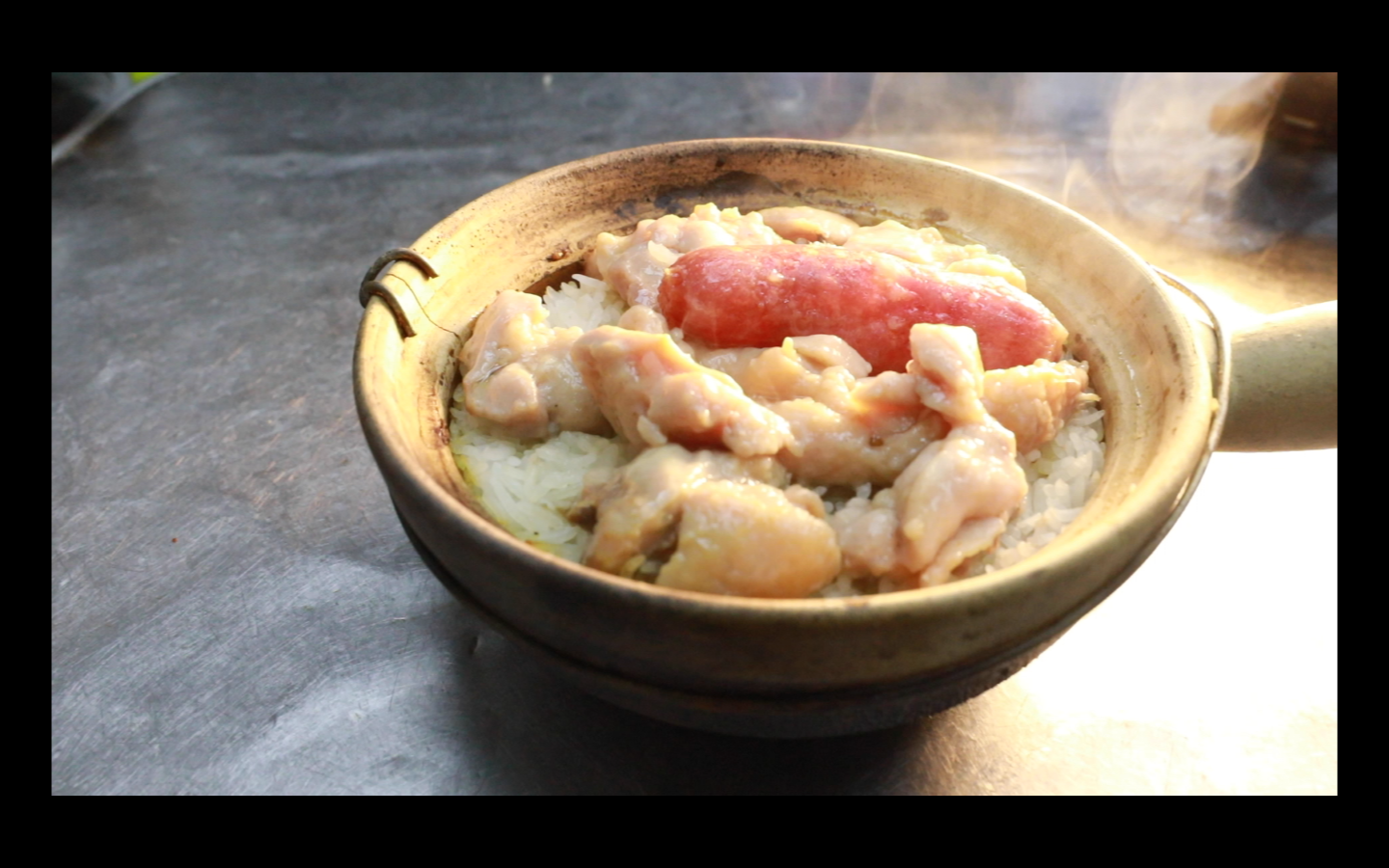 吃煲仔飯的第一個步驟,是要將陶鍋上的蓋子打開,淋上醬油。根據我的香港朋友的說法,淋上醬油之後要立刻蓋上蓋子,這是為了要讓熱氣、炭氣跟醬油的香氣一同悶在鍋裡,如果少了這個步驟,單吃原本送上的煲仔飯,味道會差很多。
