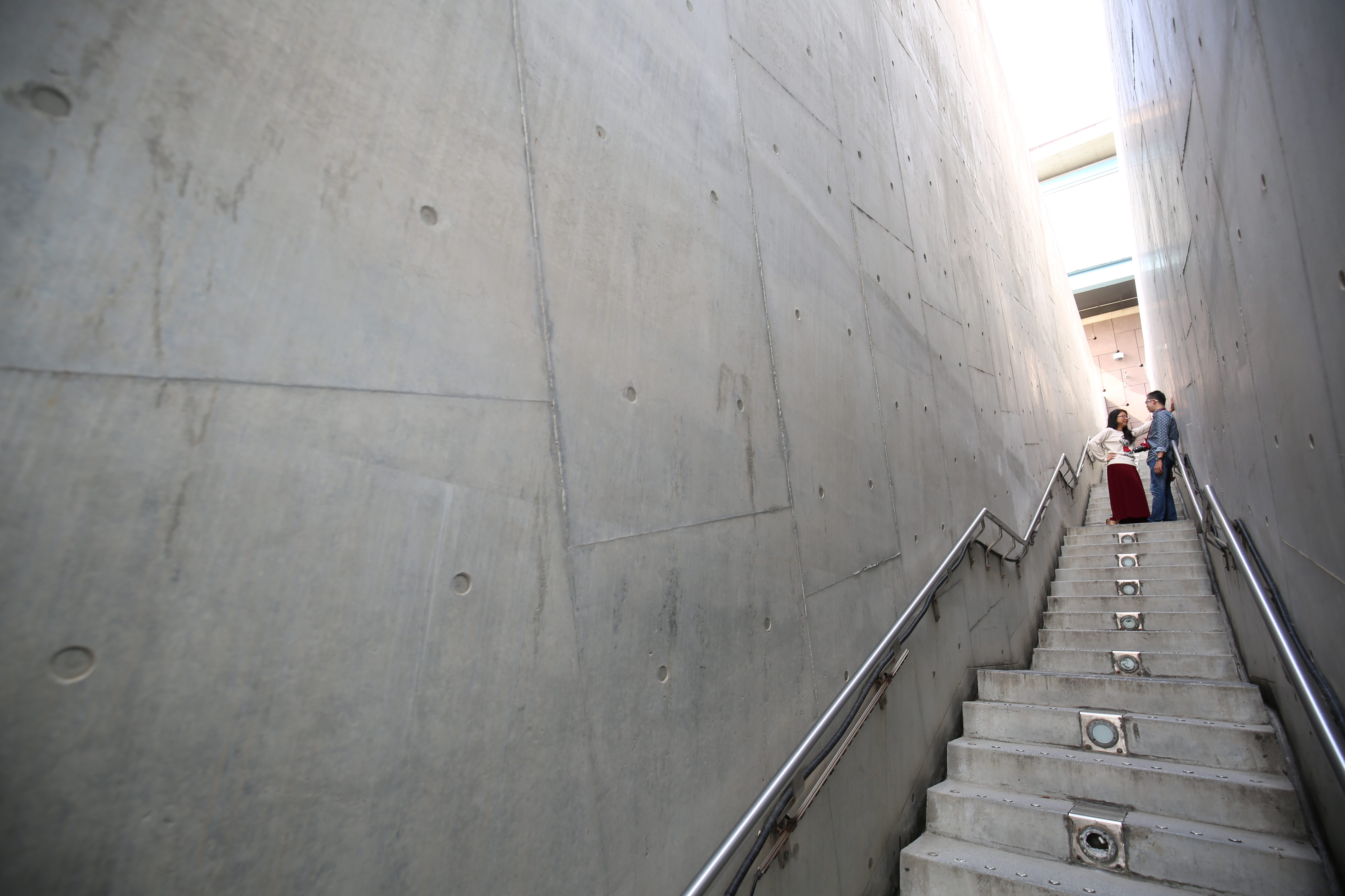 一樓深入地下1.5公尺,彷彿走進考古洞穴,忽地轉頭,擬真的考古學家正在泥土挖骨頭,叫人倒抽一口氣;抬頭仰天,光和影游移清水模牆面,不時變化出幾何線條,有如置身歐洲當代藝術館;走上騰空的樓梯,別有洞天通向戶外,灰牆石階延伸出一線天,這可是玩家口耳相傳的隱藏版「壁咚」景點。
