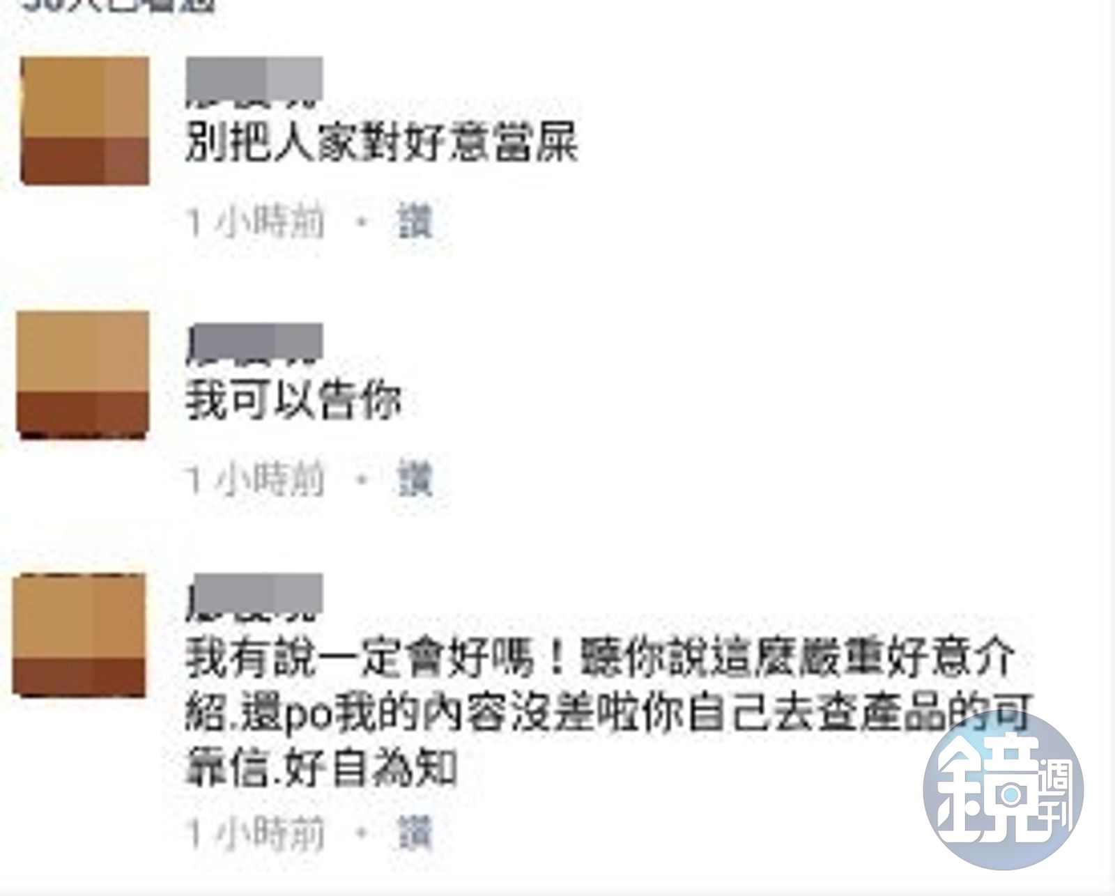民眾質疑該業務,有聽過直銷產品只能作為食品販售,並不能當作藥物宣稱療效,這樣推銷是否有違反藥事法之嫌?該業務卻出言不遜回應:「別把人家的好意當屎!」、「你是井底之蛙!」讓讀者氣得想直接提告!
