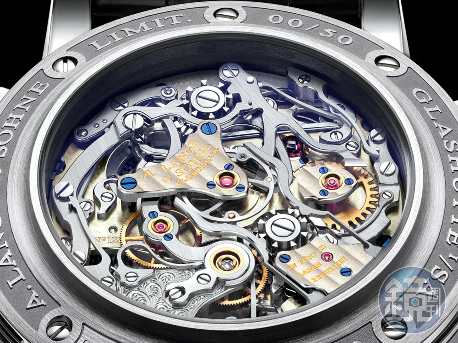 光是要在直徑僅32mm,厚度僅10.9mm的機芯空間中合理的配置684枚零件(芝麻鍊被視為單一零件,因為光它就是由636個零件所構成)就夠讓人抓頭了,但A. LANGE & SOHNE所考慮的,則是對於運轉穩定度影響更大的動力輸出品質,尤其是陀飛輪、雙追針計時碼錶、萬年曆這三項功能對於動力品質的要求都頗為嚴苛。製錶師不願意做出來一只什麼都有,但什麼都不準的陽春複雜功能腕錶,所以在這方面特別下足了功夫。但也因為發條尺寸不變的關係,動力儲存僅有36小時,算是有點無奈的妥協。