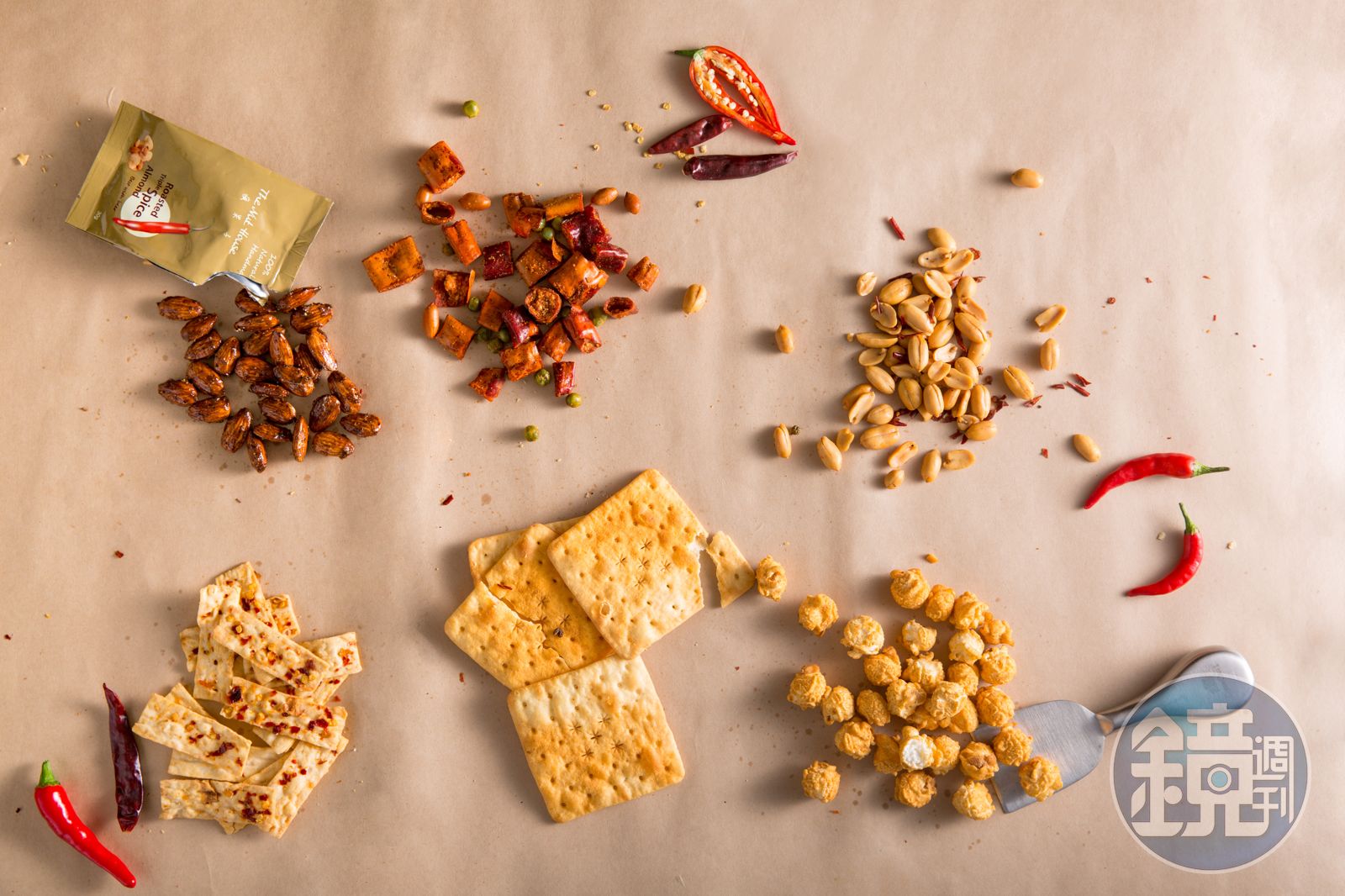 人不可貌相,零食也是,看似毫無殺傷力,就像一般堅果零嘴的「辣味茴香杏仁」(左上,「瘋果子」,360元/一盒10包),入口先是奶油的甜香,但糖衣底下藏的是雞心椒的辣勁,單吃一顆,就能感受威力,難怪做成小包裝。