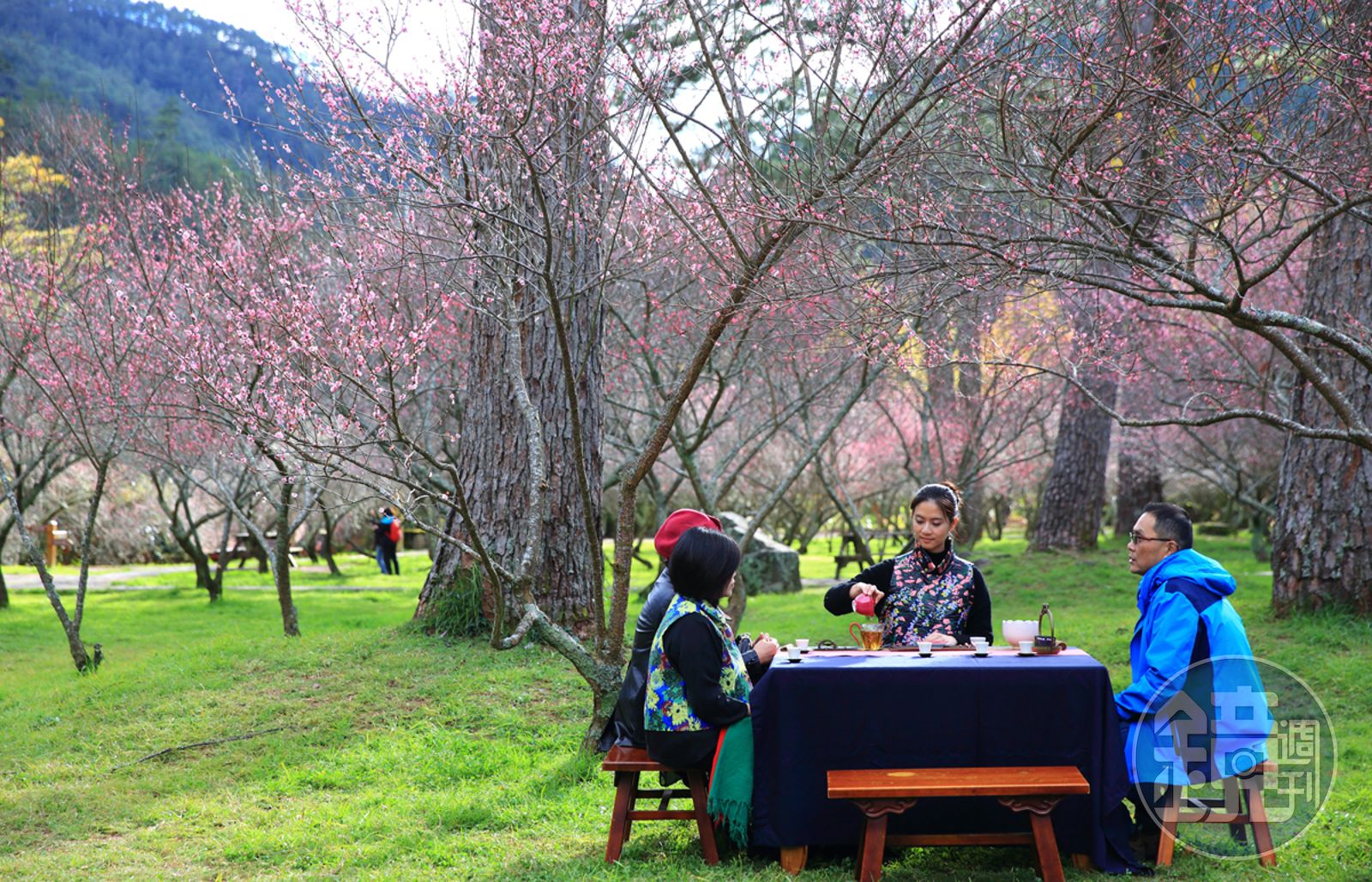 除了將國家音樂廳等級的音樂會搬到高山上,武陵農場也在梅花林中設下茶席,讓來賞花的民眾有機會體驗在樹林中一邊品茶,一邊沐浴在和煦日光下的那種不可多得的閒情。