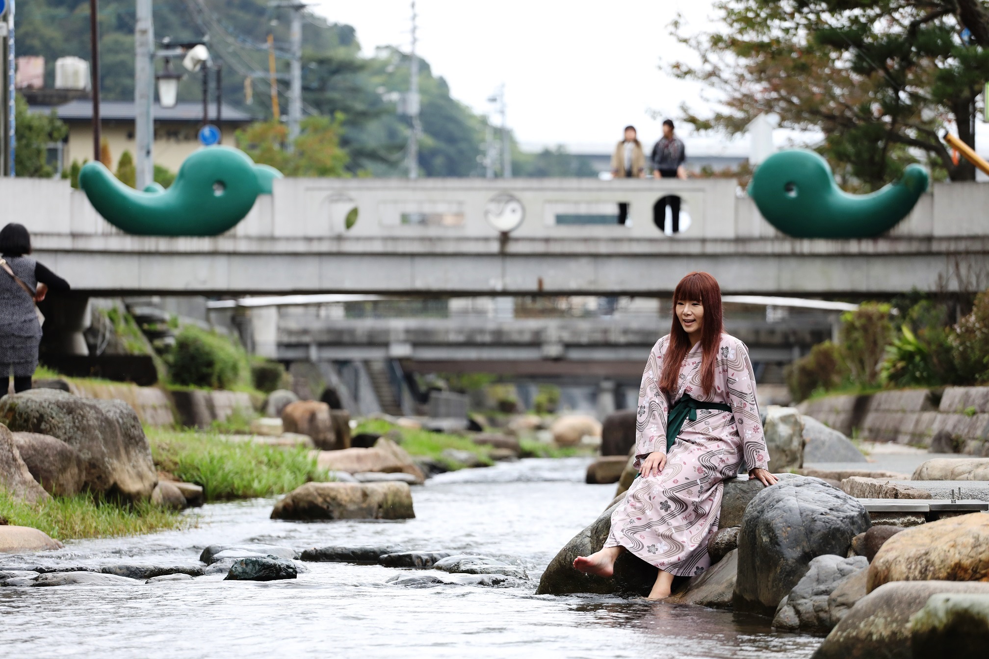 緊鄰溫泉街的路旁溪流裡,有個象徵幸運的「勾玉」,這座使用青瑪瑙石拼成的小島,隨著溪流漲、退潮會在水中浮出,當地人說,只要觸摸到勾玉,就可以帶來好運氣。