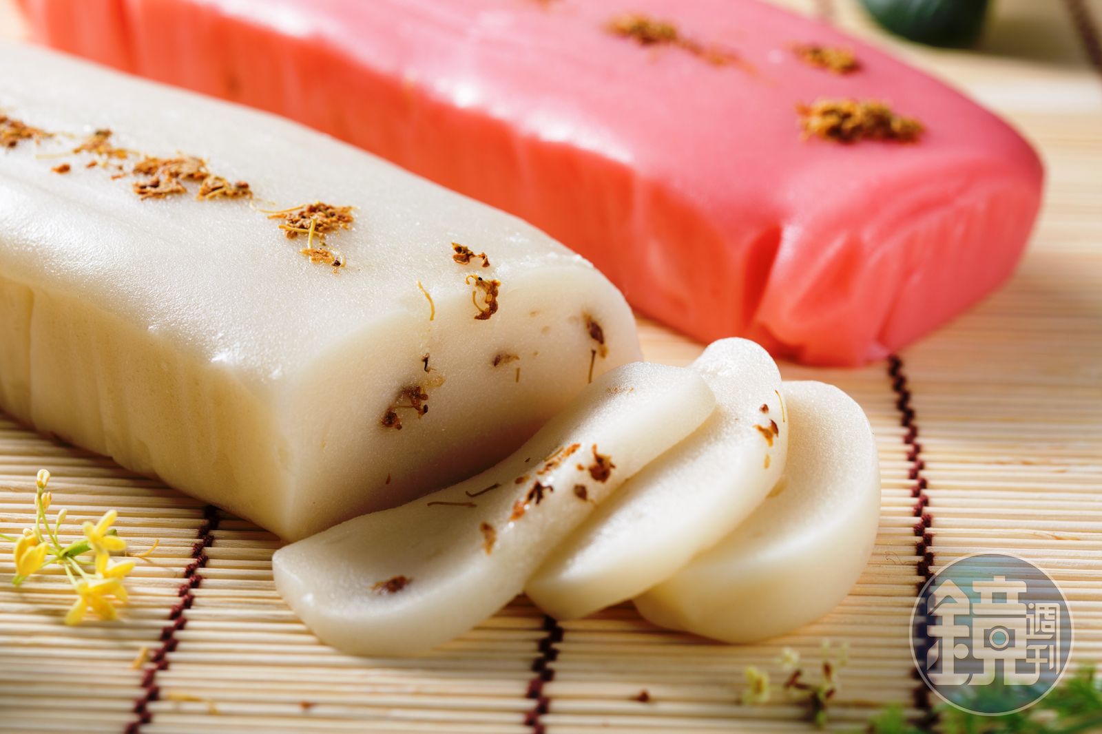 吳秉庠又以家鄉食材金桔為材料,製作出另一款「桂花金桔糕」,桂花的鹹與金桔的酸,與年糕的甜味交織,呈現另一種風味。