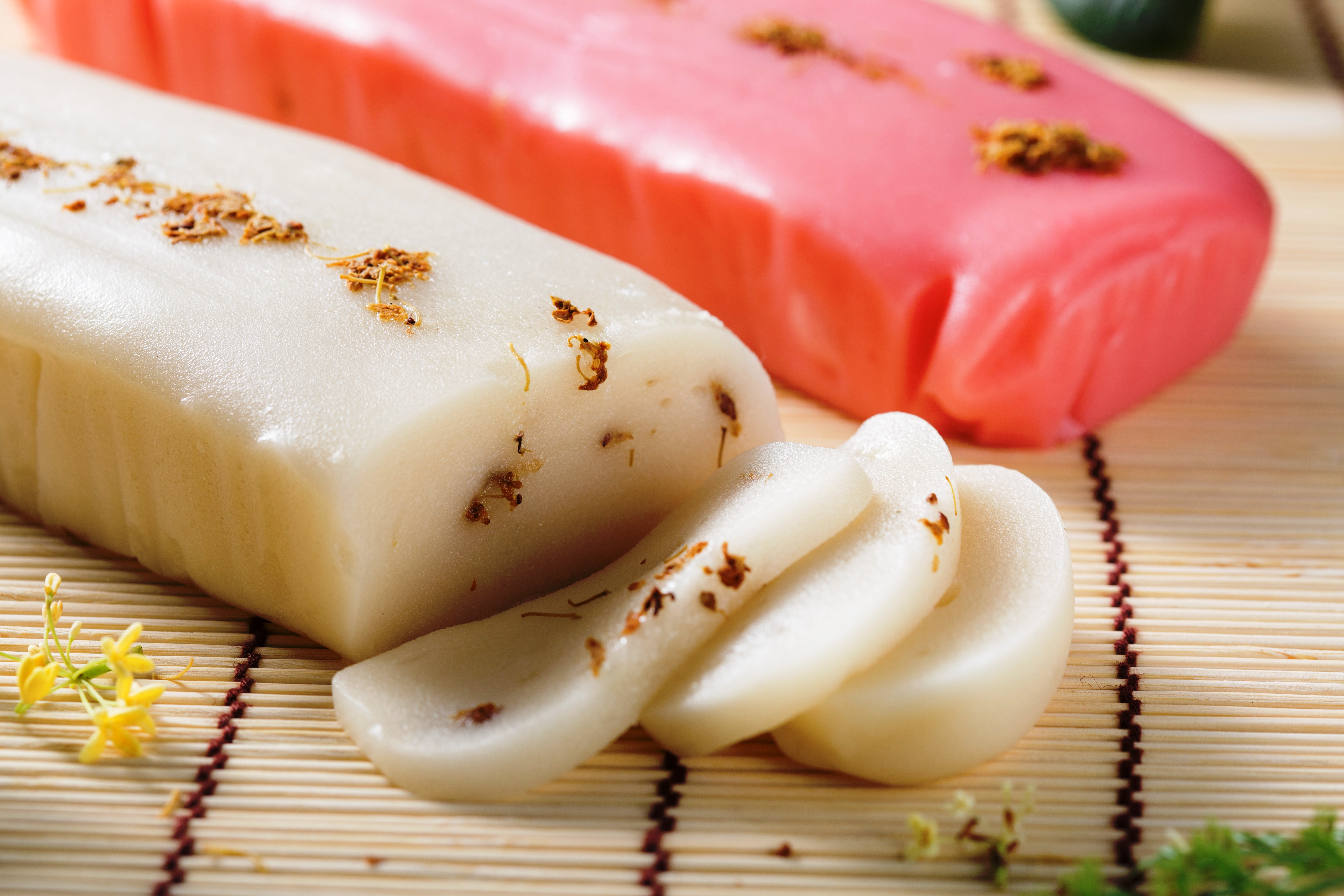 位在宜蘭只做宅配的「白鵝山腳吳師傅烘焙工坊」,師傅吳秉庠本是台北知名老店「普一食品」的廠長,任職30年,他回憶進普一所學的第一件事,就是做「桂花年糕」。 普一結束營業後,吳師傅回到宜蘭家鄉,自創「白鵝山腳」,延續已經吃不到的「桂花年糕」這個令人懷念的味道,5年來有不少老客人專程前來回味。 桂花年糕和傳統年糕作法不同,將糯米粉與糖混合後,放入蒸籠蒸熟,最重要的就是甫出籠的高溫糯米,必須用雙手在空中又甩又拉,甩出糯米糰中的空氣,讓口感變得比較紮實,接下來將糯米切成小塊,像製作中式糕餅的手法,先擀平再捲起又壓平,最後鋪上桂花醬,年糕好不好吃,就靠這雙充滿經驗之手。