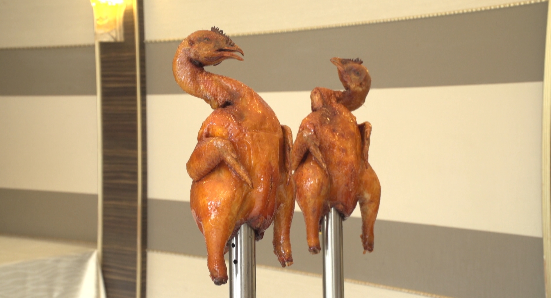 勝記酒家主廚陳渠沛說,「企鵝春雞」因為上菜時雞是站著、外型像企鵝,所以才以型為名,而且讓雞學企鵝站著,還有學問,主要是為了讓雞排出多餘的油脂,雞皮才能保持脆度。