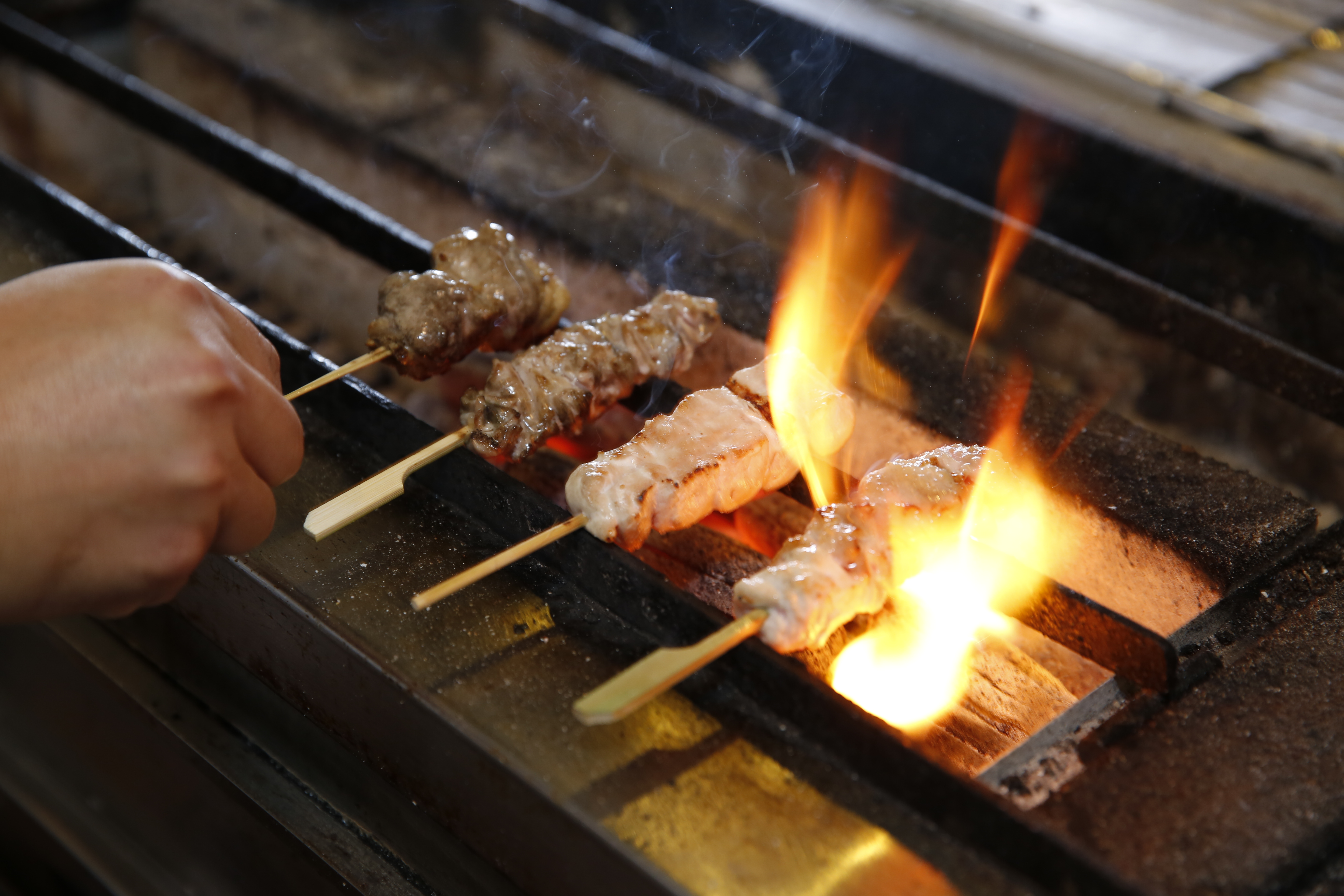 「鳥哲」是夫妻創立的第2個品牌,選用雲林桂丁雞,以備長炭炙烤出各色雞肉串燒料理,遵循日本習得的全雞拆解技術,下刀精準,蕭哲文說:「多切一刀肉質水分就會多流失一分。」串法也很講究,竹籤得串在肉的中線,使左右大小均等,且每串長度相同,放上烤台受熱才均勻。