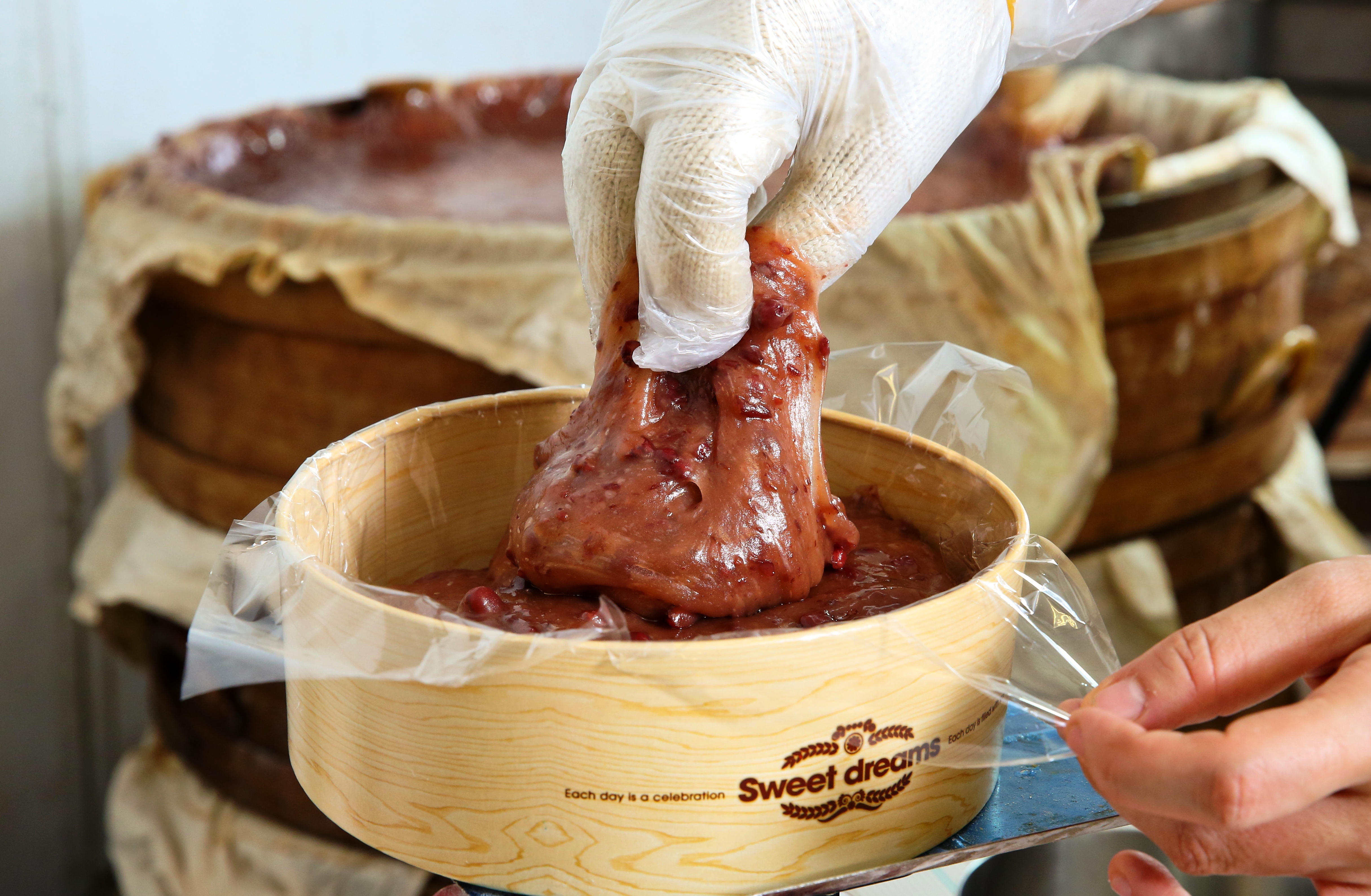 「每年我都說不想再做年糕了!還是被客人催著做。」笑稱自己每年賣年糕,都是被逼,高雄阿綿麻糬老闆娘唐翊甄笑開了花,有著被客人需求的滿足感。 悶熱廚房裡,從泡米3小時,磨米、壓乾水分2小時,煮紅豆又是2小時,拌料、竹籠蒸熟4小時,光是製作年糕,就要花掉半天。唐翊甄說,工時太長,只有過年前才開賣,平常只賣麻糬、大福等產品。 花時間還不打緊,扛著一袋袋磨好的米漿,慢慢壓乾,我深怕她閃了腰,但她說外婆就是這樣做年糕,傳統方法不能改變。她堅持不用脫水機,擔心營養流失,「我們選擇了沒人願意做的方式,工時和投資報酬率都不划算。」