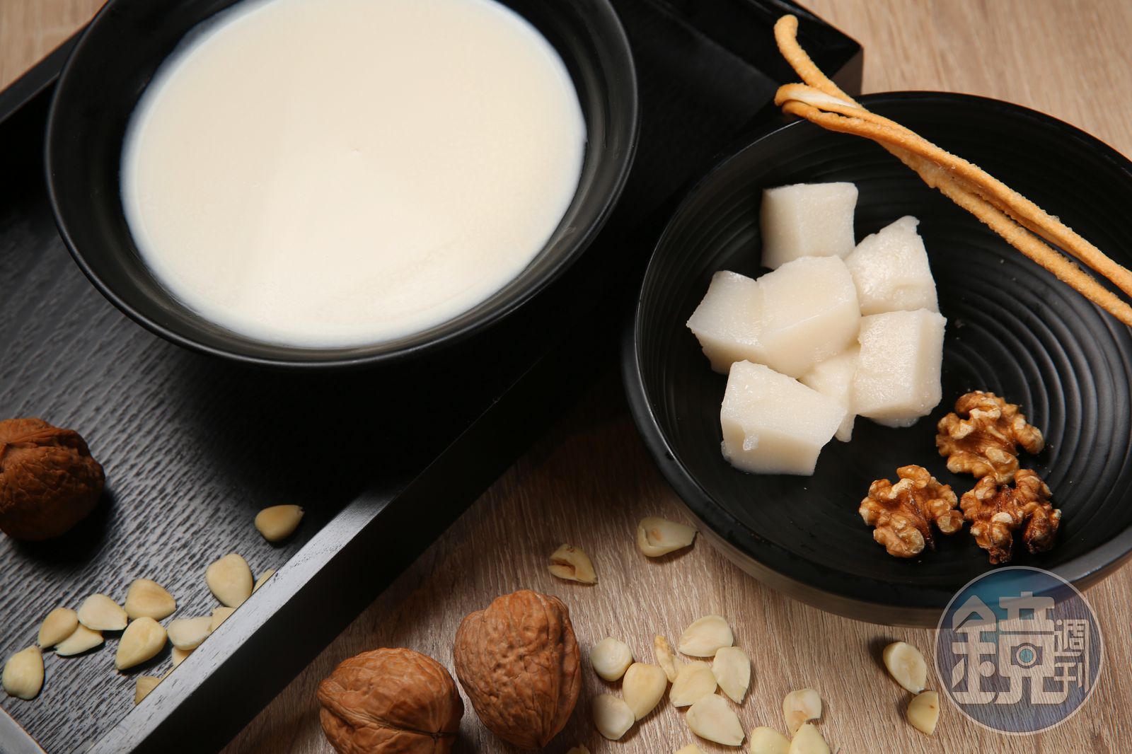 兄弟倆玩轉傳統熱甜湯,確實變出新意形式美,「桂花銀耳蓮子湯」同時使用乾燥桂花與桂花蜜,在爽滑銀耳間點綴雙重花香;「養生杏仁套膳」源自杏仁茶加油條的經典組合,卻以酥鬆脆的麻油繖子取代油條,養生吃巧不吃飽;「杭菊桂圓茶」則以桂圓糖水為底,可自己選搭喜愛的配料入茶,甜茶變甜點,湯面還有幾朵苗栗銅鑼來的杭菊寫意,菊涼化解桂圓燥,最是適口。