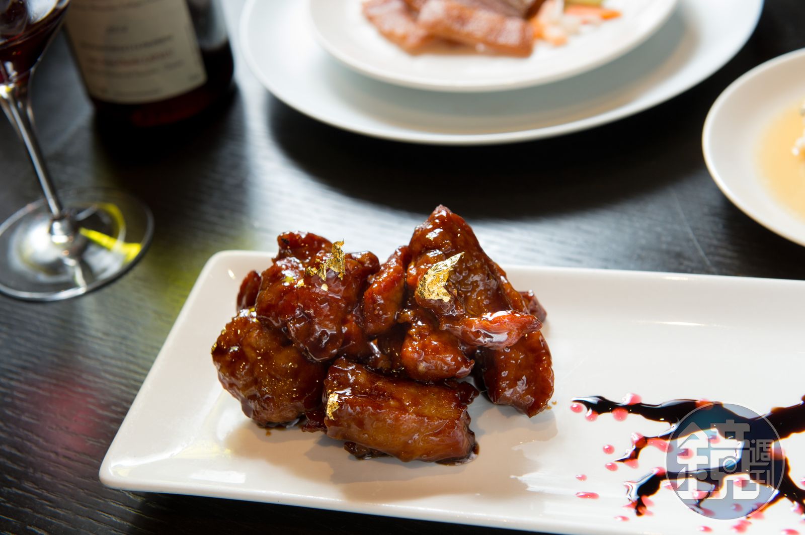 這道酸甜生津的糖醋肉,點上金箔看來貴氣,肉質酥嫩。一嚐,陳匡民就得意的笑說:「不好意思,這回合應該是我贏。」讓她自信滿滿的酒款是來自法國隆河的紅酒,「一般用格納西(Grenache)葡萄釀的會有糖果軟甜味,但這支卻是高雅,還帶有香料味。」搭上醃過的糖醋排骨,能夠讓口腔清爽,尾韻拉長。