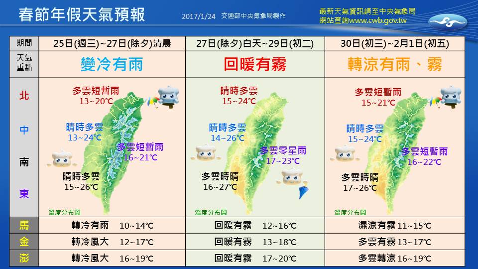 中央氣象局表示,25日起受到大陸冷氣團影響下,各地清晨與夜晚都有涼意,26日小年夜天氣開始轉乾,中部以北和東北部低溫下探14度,白天也僅有17至19度,中南部白天則是22至23度之間。 除夕開始冷氣團減弱,會明顯回溫,除夕到大年初二溫暖而偏乾,天氣相當舒適,各地大多是陽光普照,僅東半部和北部山區偶有零星雨;溫度方面,白天相當暖和,北部及東半部高溫將回升至24、25度,中南部甚至可來到27度,但中央氣象局提醒,中南部日夜溫差大,提醒民眾早出晚歸要多注意氣溫變化。 初三起至初五收假受到東北季風增強,迎風面的北部和東北部降雨機率提高,溫度方面,北臺灣受冷空氣影響氣溫稍降,中南部和花東由於雲量較增多,高溫也略降。 中央氣象局提醒民眾春節天氣系統變化迅速,提醒大家留意最新公布的天氣訊息,以及最新的天氣預報。