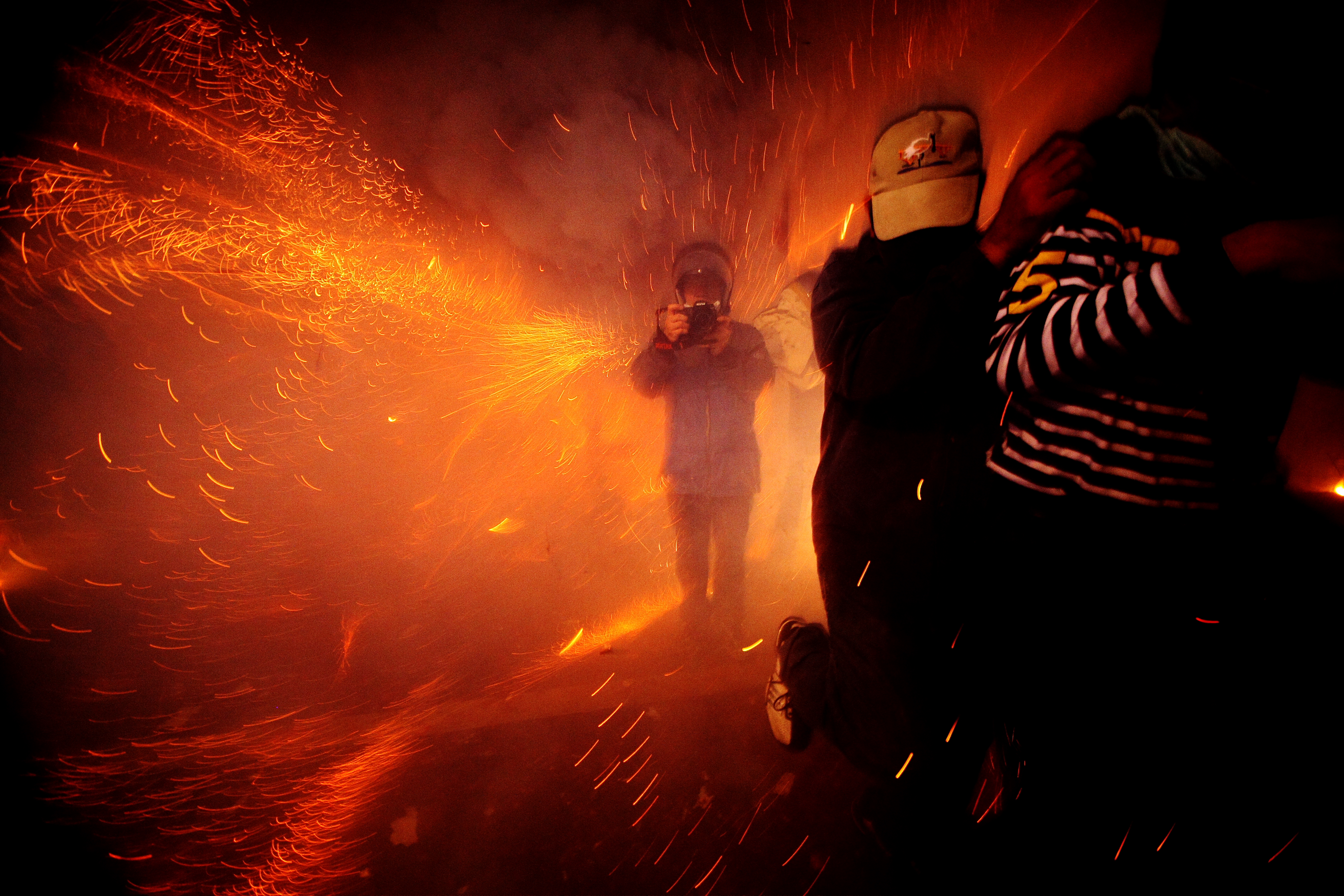 為了拍照,必須衝到最前面炮塔,霎時間,萬炮齊發。炮火還是往身上招呼,隔著外套依然將手臂炸出一塊淤血。難怪曾有國際媒體將鹽水蜂炮選為世界十大危險節慶之一。