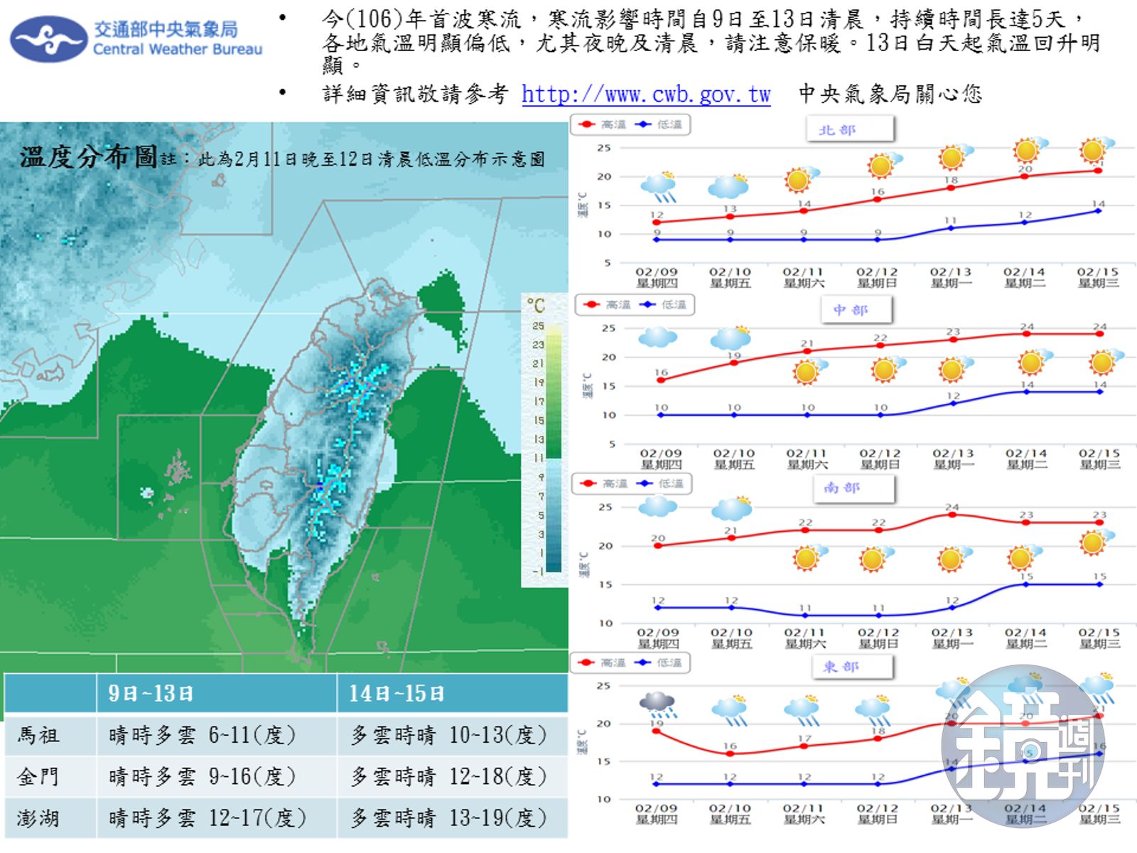 中央氣象局今天特別製作一張圖表,清楚表達這次寒流的溫度分布圖以及北中南東的每天溫度曲線,入冬首波寒流將影響台灣長達五天,這是是繼去年霸王級寒流後,全台幾乎都會在11℃ 以下呈現少見的「藍色凍蕃薯」。