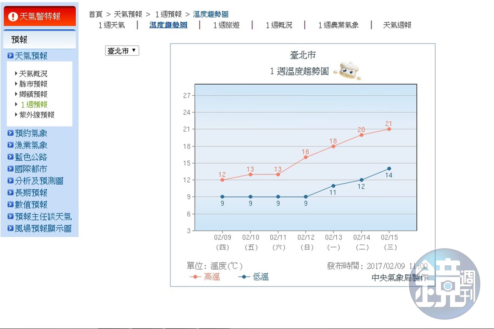 首圖:中央氣象局預報未來一週天氣,最低溫下探9度。(翻攝自中央氣象局)