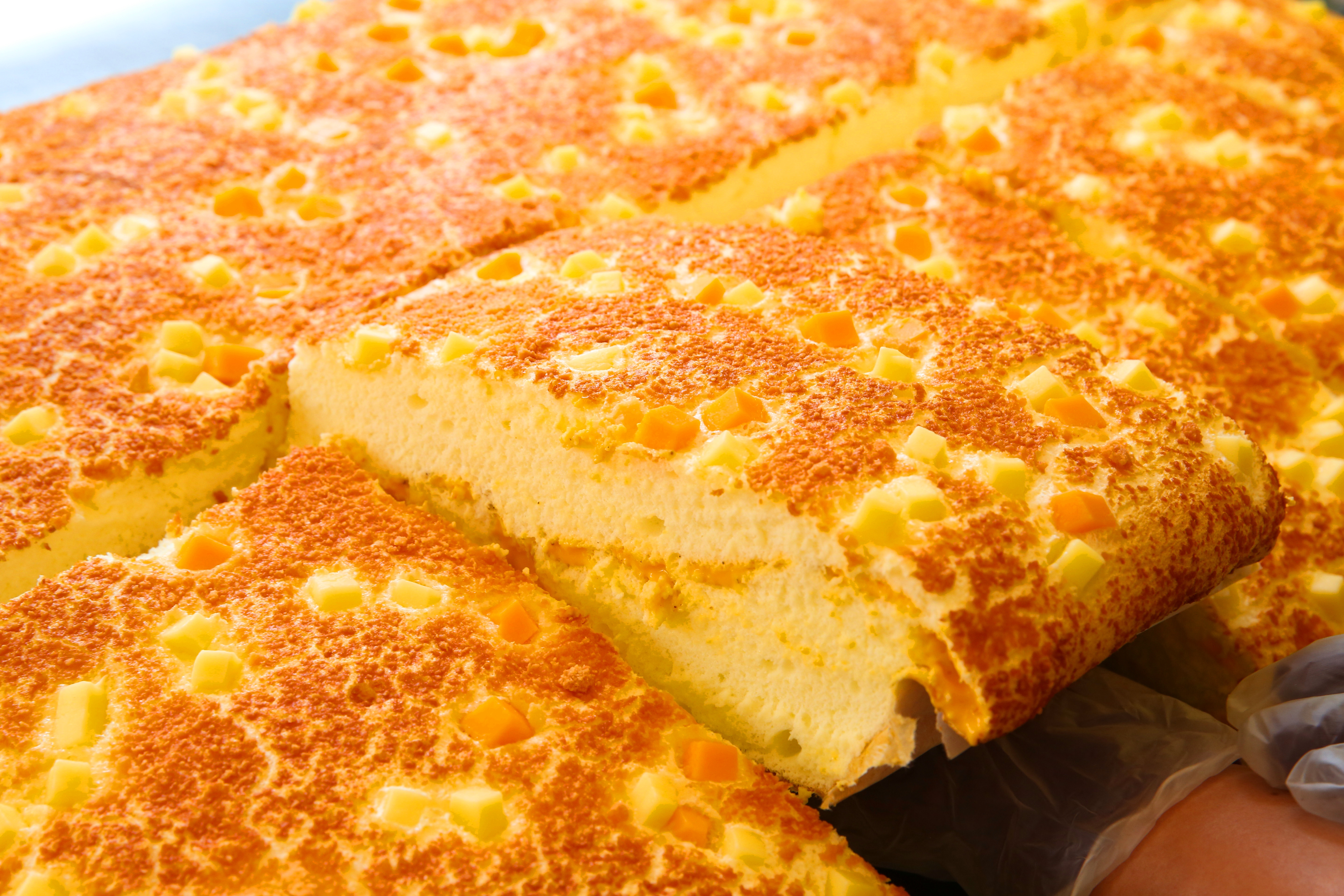 原本是2百坪糕餅代工廠的「品銘」,因被毒油風暴波及,第二代吳紹玄接班後,轉型做無油蛋糕。不過,蛋糕要無油,並非單純不加油而已,走進吳紹玄的廚房,氣溫計、溫度計缺一不可,他強調,關鍵除了溫度,還是溫度。 瞄一眼牆上氣溫計,吳紹玄說,像今天的氣溫23.5度,蛋黃糊(即蛋黃加鮮奶加麵粉)就要加熱到32度,得依當天氣溫調整溫度,「天冷就加熱一點,但太熱的話,蛋糕口感會太蓬鬆,太冷又太紮實。」無油蛋糕怕冷也怕熱,稍一閃失都不行。 「蛋白打發後是25度,與蛋黃糊混合後,溫度會均衡在28到30度。」吳紹玄做蛋糕彷彿化學實驗,這數值是經過1年多瘋狂試驗後,得出的結論。負責在外場烘烤蛋糕的哥哥吳泓毅回憶,「過程很痛苦,每天都丟2、3籃雞蛋,而且每次做只能改1個變因,才會知道哪裡出問題,只能一直重做。」