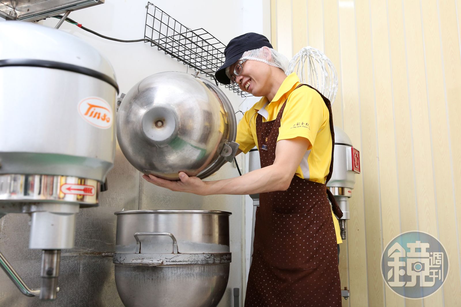 為了家業,他考上高雄餐旅學院,念西點烘焙,畢業也在85度C工作過1年,「從小都在這個環境,我逼自己跳出舒適圈,去給人家罵。」學到85度C對糕點的高標準,也發現自己經驗不足,加上家裡缺人手,吳紹玄再度返家工作。