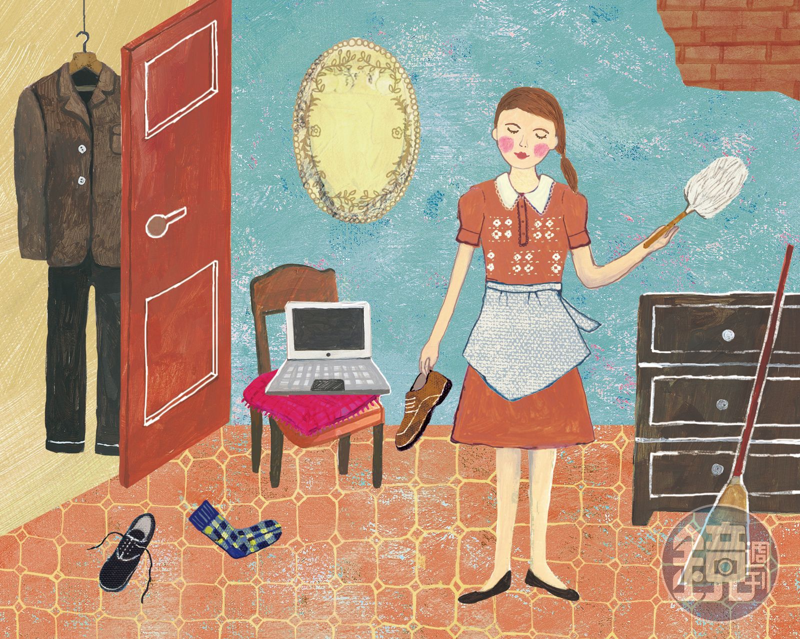 房間裡順著衣物的堆置方位就可以判斷出丈夫的行經路線,起床後先將睡衣丟在床上、睡褲脫在地上,衣櫃打開沒有關好,棉被更不用說,她要等丈夫離開才像個老媽子在後頭收尾。結婚前,她同丈夫回家,丈夫回到老家就蹺著二郎腿看電視,婆婆一邊噓寒問暖一邊切好水果侍候,她發覺自己好像變成了婆婆的替代品,照顧一個永遠長不大的彼得潘。