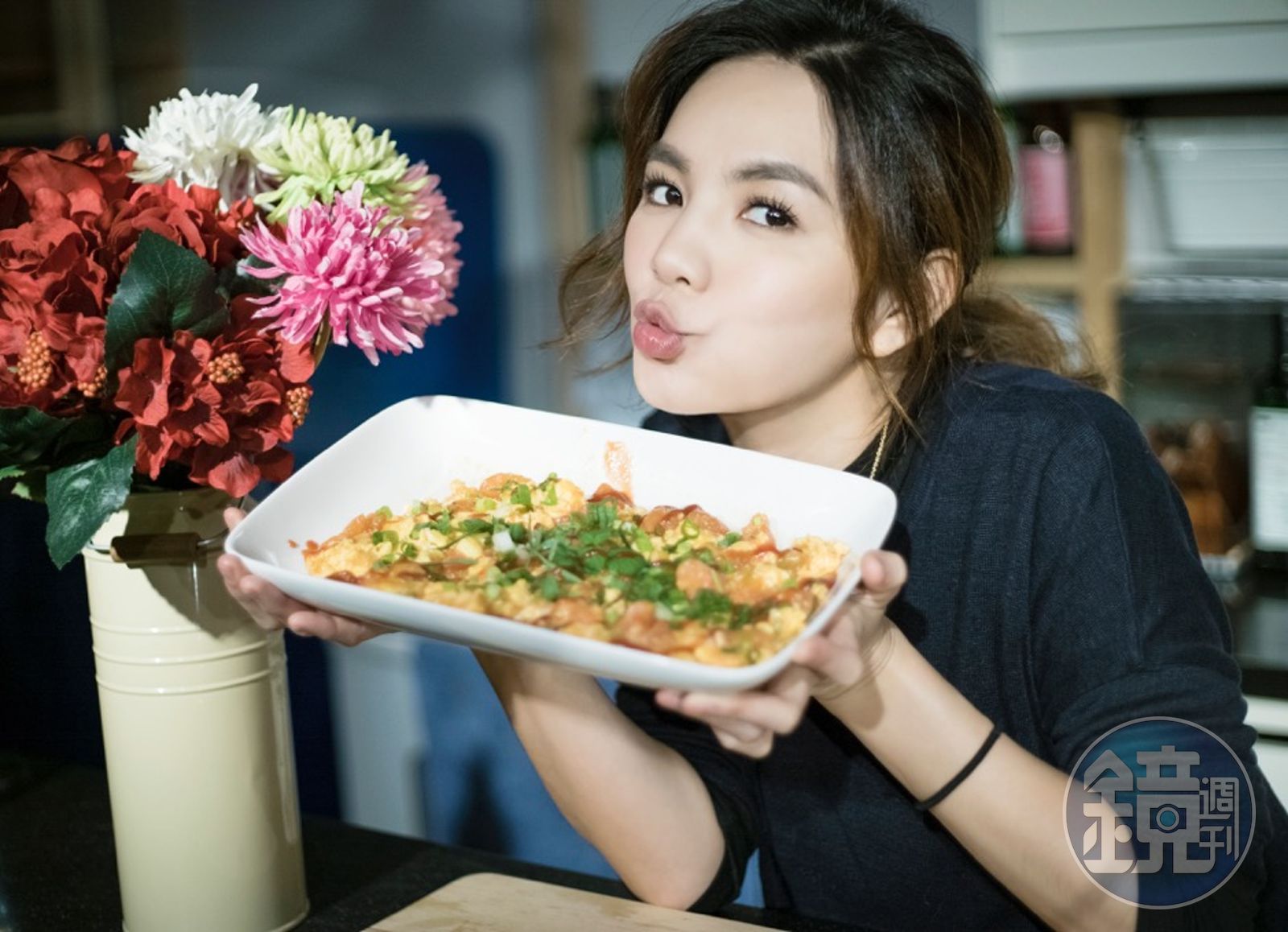 雖然邊煮菜邊搞笑,Ella在切蔥時仍可看出她的刀功,打蛋、拍蒜也很專業,炒菜時教了不少料理小撇步,證明姐姐是有練過的。