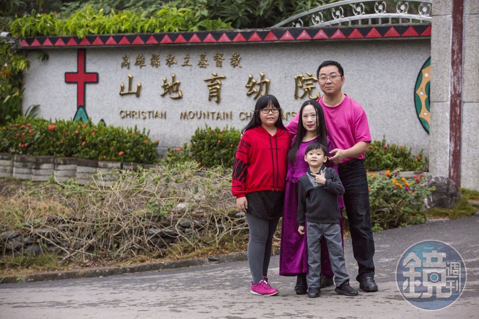 首圖:楊恩典(中)與先生陳信義(右一)育有一對兒女,一家人經常回到六龜育幼院。