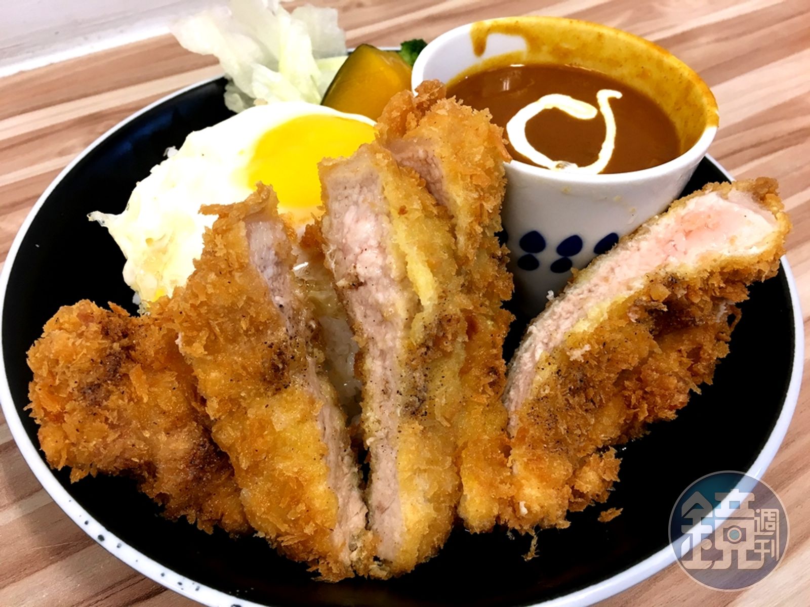 「豬排咖哩」的炸豬排厚達一公分,肉質紮實又有鲜甜肉汁。(130元/份)「豬排咖哩」的咖哩醬濃香微辣,還有燉得鬆綿入味的馬鈴薯塊。(130元/份)另款「唐揚雞咖哩」人氣也毫不遜色,試吃當天看到大概有7成客人點這道,咬下一口炸雞,我就知道原因了,因為好Juicy啊!唯一缺點是油瀝得不夠乾,稍微油了一些,但一旁有附生菜沙拉和太陽蛋解油膩。
