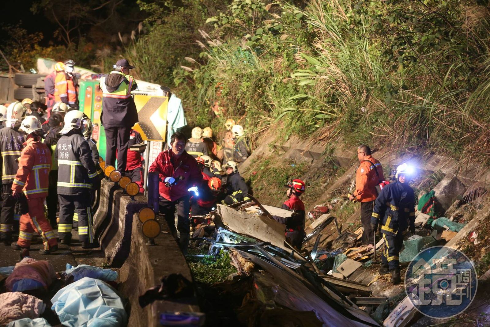 警消在遊覽車翻覆處緊急搜尋,把握黃金時間搶救傷患。發布時間:2017.02.14 07:00 臺北時間