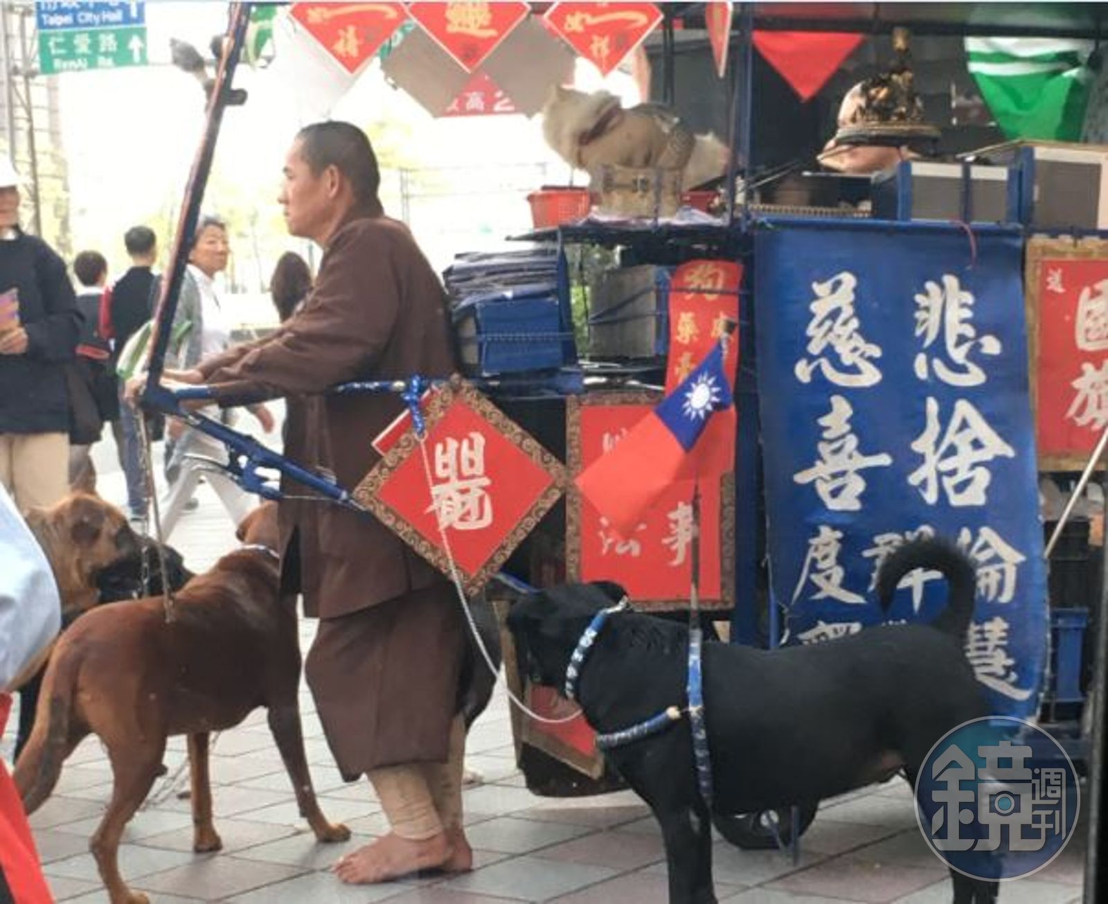 自稱「狗王廟」、「柯神廟」的九旺廟,近日被本刊直擊和尚指揮群狗,拉電子花車、背插國旗的形式,再現於車水馬龍的台北街頭。領頭的和尚穿著袈裟、赤著腳,在刑事局對面的忠孝東路人行道上,向民眾募集動保善款。記者觀察,現場不知情的路人覺得有趣,但部分熟知該宗教團體事蹟的民眾,則抱著嗤之以鼻的目光快步走過,直說:「怪廟又來了!」