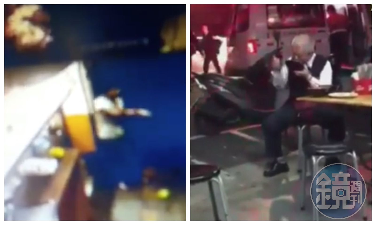 當時在場的客人雖然嚇傻,但仍不忘拿手機錄影po網,而畫面中的一位阿伯也意外掀起討論。原po表示:「麵才剛送到,就遇到在我背後一群人,拿著刀跟電擊棒砍一個人⋯人已送醫」。