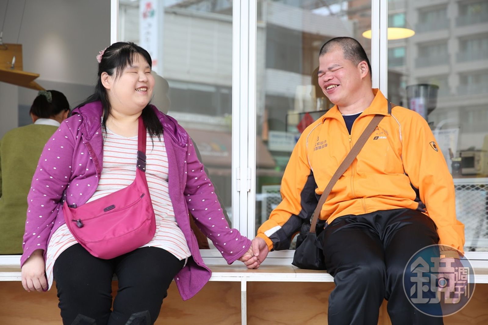 我很喜歡運動,讀書時是視障柔道國手,畢業後開始打盲人棒球,常回學校練習,那時去她的教室找一個朋友,她問我是誰,我裝酷,沒有理她,結果她竟然很用力打我,還用原子筆在我脖子上塗鴉,後來我跟她要電話,就交往了。