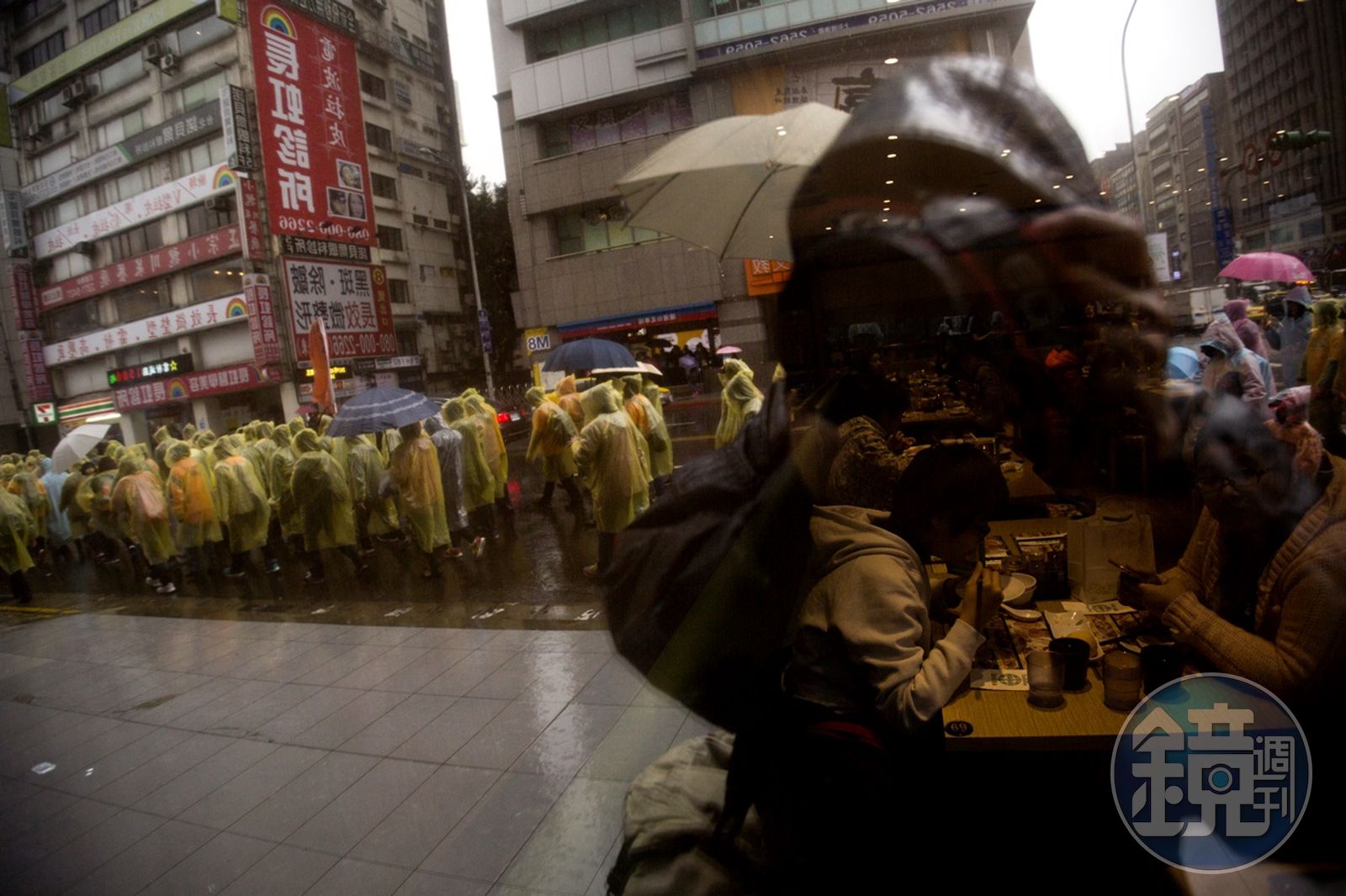 「反搭便車反打壓大遊行」隊伍在大雨中行經公園路,引起路旁用餐民眾側目。
