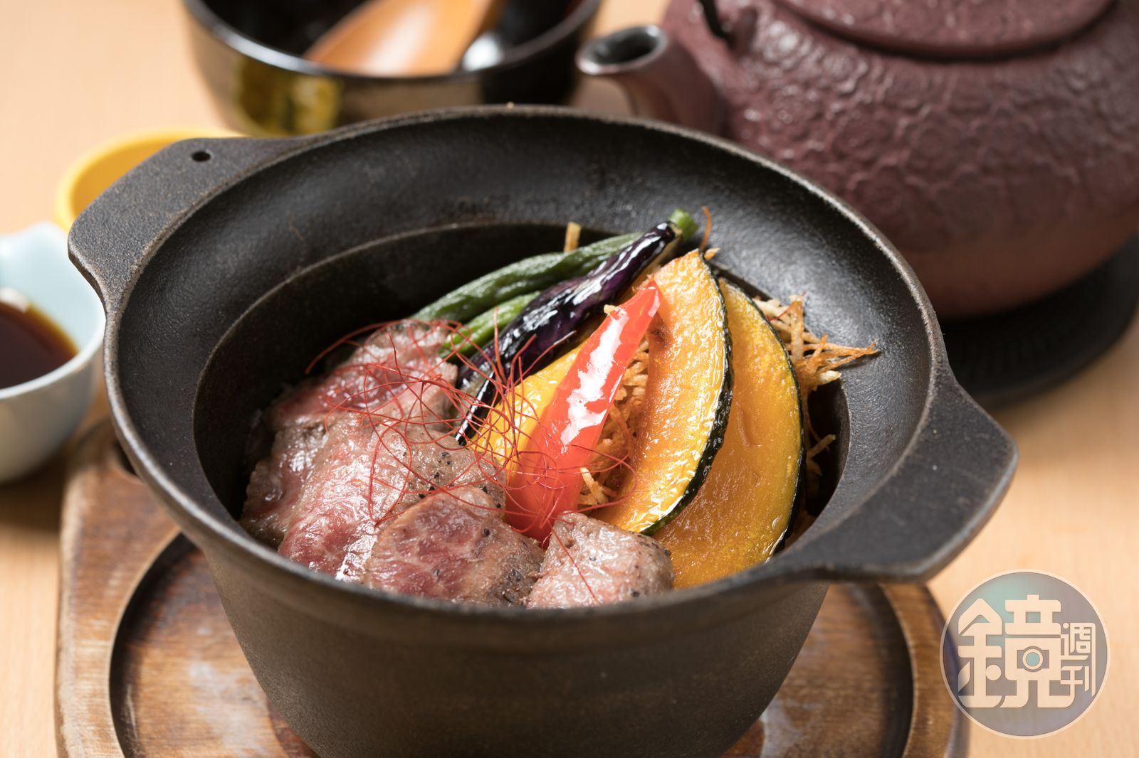高橋主廚說了,南部鐵器的保溫性極佳,能讓茶碗蒸、土瓶蒸保持剛出爐的溫度,牛排蓋飯放在裡頭,還能製造鍋巴效果。在我看來,鐵器耐摔耐磨,耗損率極低,相當好用。當作食器上桌,外觀又美又特殊,能讓客人愛不釋手。唯一缺點是太沉重,服務生的臂力要練得特別好,否則可扛不動這沉重甜蜜的負擔啊!