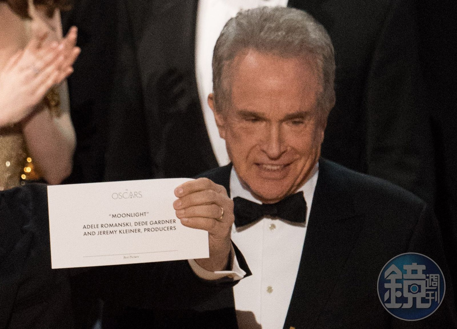 華倫比提頒發最佳影片,誤將《月光下的藍色男孩》頒成《樂來越愛你》,引發本屆奧斯卡最大鳥龍,他在台上臉露尷尬。(東方IC)發布時間:2017.02.27 14:02 臺北時間
