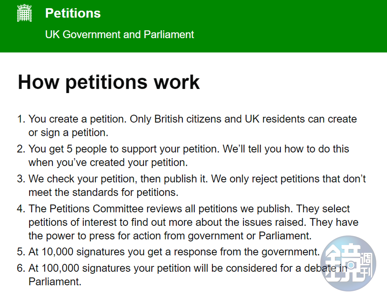 至於英國國會電子請願網「e-petitions」則僅限英國公民及居住於英國的居民提案,提案時要獲得5人連署附議並審核通過就可上線,若在半年請願期內獲得1萬人附議,可獲得政府回應;獲得10萬人附議,則該提案可能交付英國國會中成為辯論主題。且英國國會下議院還由11位議員設置請願委員會,處理相關事務。
