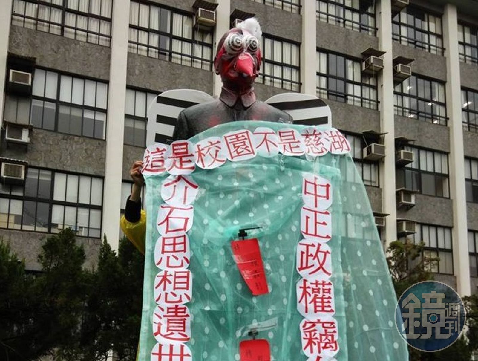 去年的228前夕,包括今年被逮捕的宗教系羅姓學生等4人為銅像裝上眼睛、翅膀並套上蚊帳,蚊帳上還有「中正政權竊台似針筒」、「介石思想遺世儒瘧蚊」「這是學校不是慈湖」等文字,還有學生在現場潑灑紅色油漆,表達蔣介石是「吸血瘧蚊」。