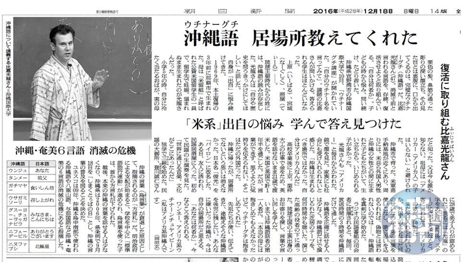 而在去年10月,有許多散居於世界各地,仍在日常會話使用包含沖繩語在內的「島言葉(島くとぅば,沖繩縣的各種地方語言)」的沖繩移民,從海外赴日參加「世界沖繩人大會(世界のウチナーンチュ大会)」。然而他們一回到沖繩縣當地,卻有「明明回到了老家,當地卻幾乎沒人講『島言葉』,真是叫人感到寂寞」之嘆。比嘉光龍也藉此,與沖繩縣當地報紙《琉球新報》合作,推出專欄推廣母語,幫助世界各地的沖繩人能夠溝通無礙,使用母語盡情交流。