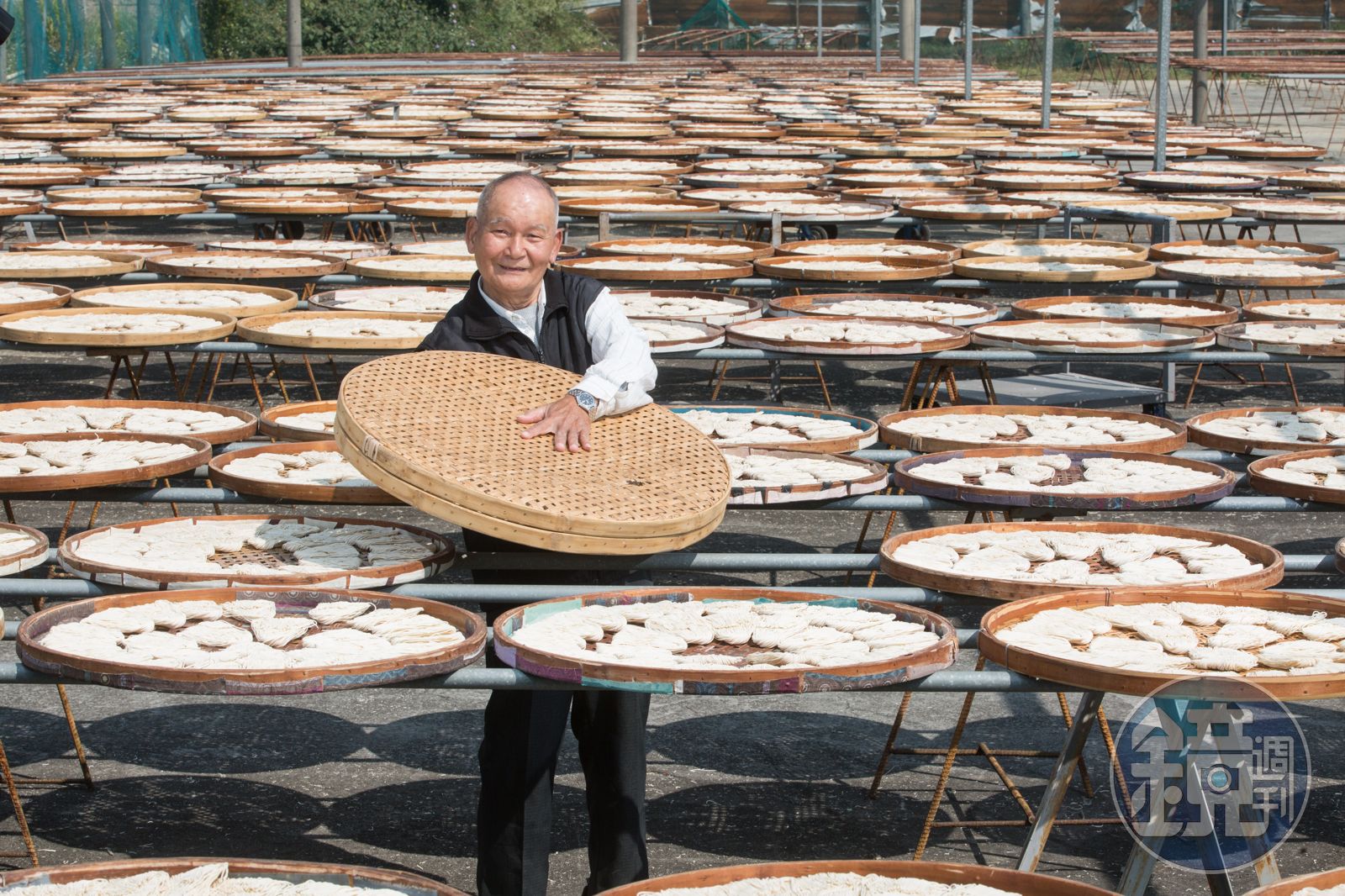 再轉往合進,除了廠房比李玉珍的更新、更大,機器也明顯新穎進步,就連曬麵場也架著淺綠色的防鳥網,比李玉珍的傳統無遮蔽曬場更具規模。