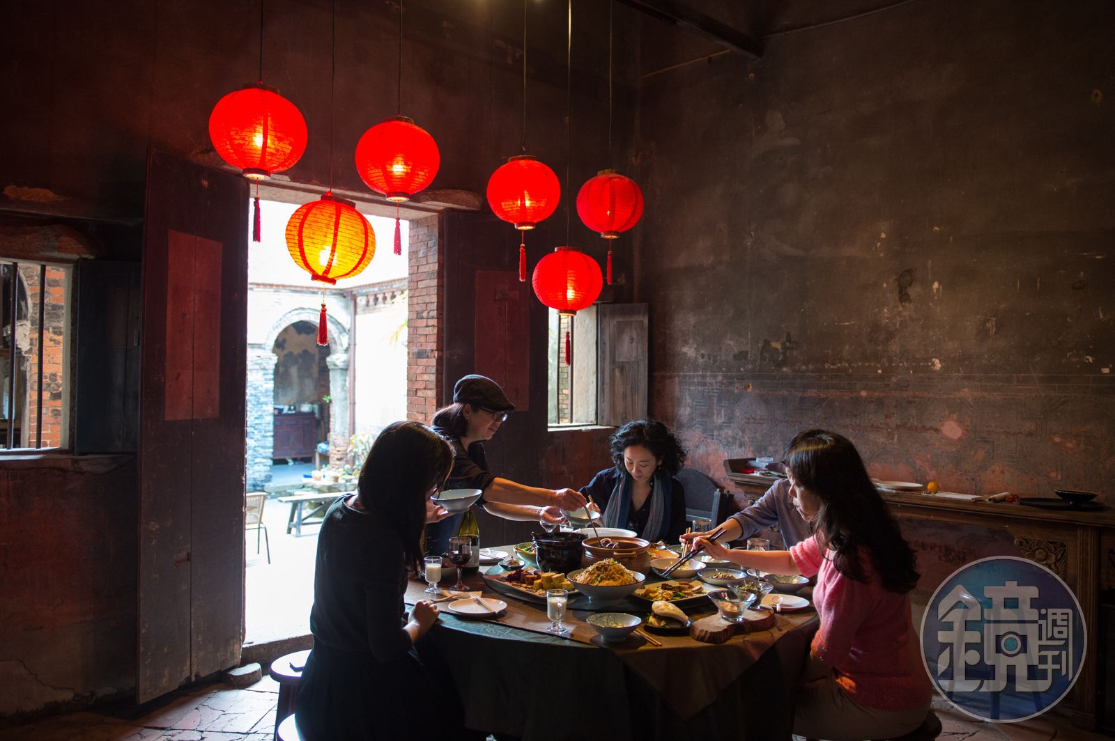 開飯時間到,黃瑞真捧著大碗公裝著煙氣騰騰的炒米粉,踩著龜裂的紅地磚,穿過綠蔭庭院,踏進掛著紅色燈籠的廳堂,一起把剛剛煮好的「腐乳醬封肉」「剝皮辣椒雞湯」和「滷白菜」挪到大家都方便挾取的桌面位置,並為同桌的人盛湯、挾菜,就怕有人沒吃飽。
