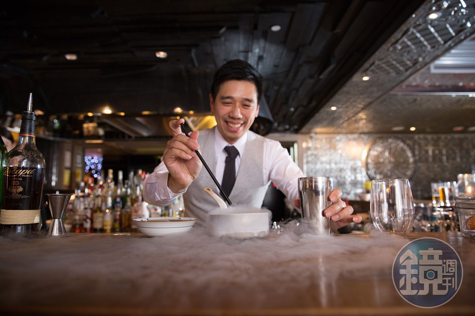 台式古早味的「綠豆杏仁露 Green Garden」詼諧上桌!舀著碎冰和食材入口時,會感受到苦艾酒和冬瓜茶引出來的熱帶果香味,利用分子調酒凝結的綠色晶球,讓這杯調酒口感結合了脆、彈、沙粉感等口感,趣味十足。(限量10杯,600元/杯) Nick在調製分子調酒時使用液態氮,-196度低溫產生流洩的白濛煙氣,煙霧繚繞吧檯,空間猶如置換到實驗室。 等到煙霧消散,Nick很戲劇性撈出「不是綠豆的綠豆」,分子調酒手法讓人覺得科學又魔幻。 我還在開心吃著綠豆杏仁露,Nick已經玩得煞不住車,隨即再端出「中式養生」的「紅棗桂圓雪白 Smokey Snow」,他先壓碎帶殼龍眼,拿噴槍點火燒殼蓋上酒砵煙薰,接著把浸泡桂圓的波本威士忌加煙燻烏梅糖漿,與紅棗糖水攪拌調勻,再拉高到60公分高度把調酒倒入酒器裡,這招式除了耍帥,「更重要是為了讓空氣進入,打開調酒風味。」看似清香甜滑的桂圓雪白樣子古意老實,其實酒體挺厚實,好酒沉甕底,小心越喝越茫。