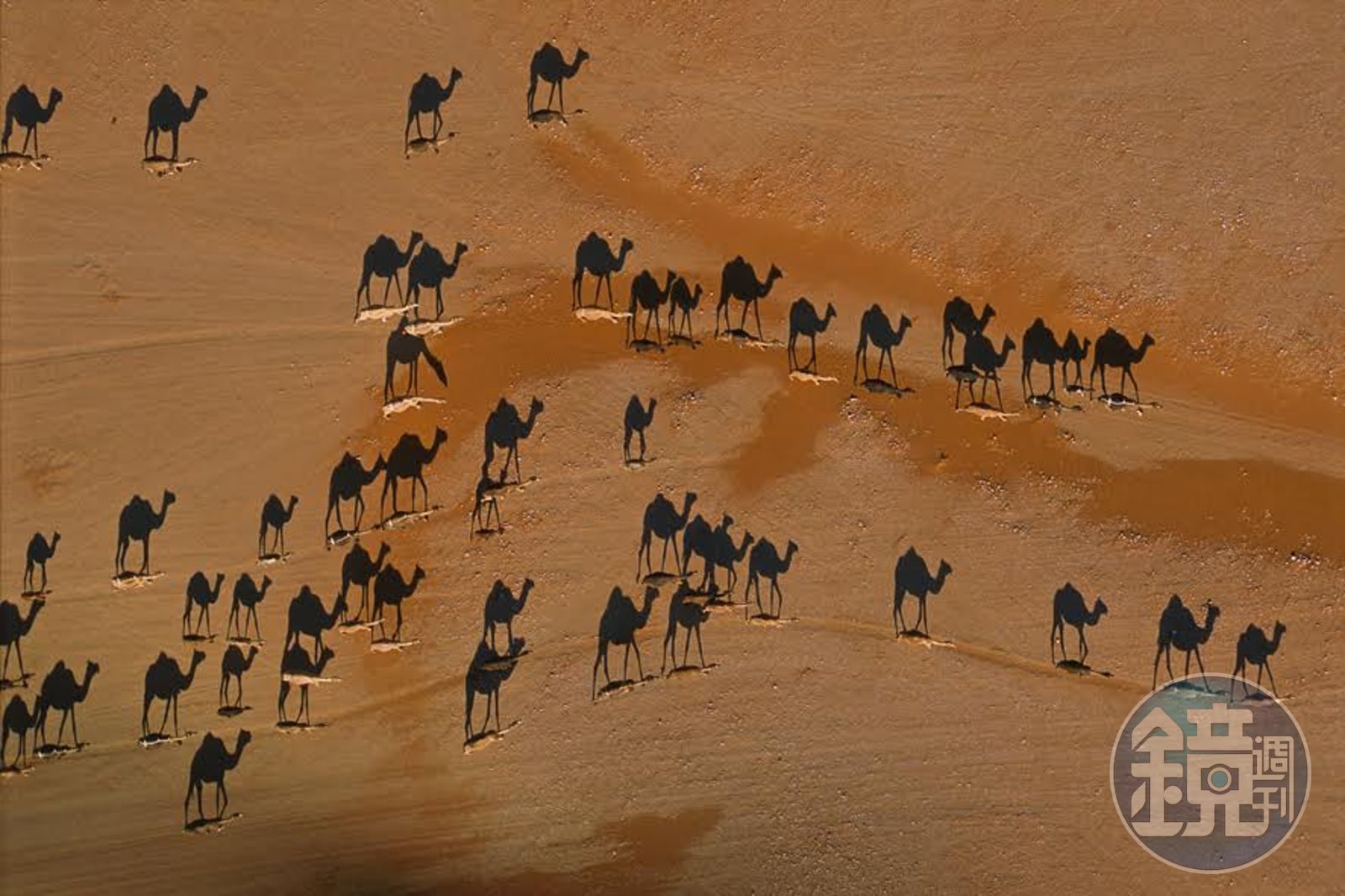 沙漠中行走的駱駝商隊、奔跑中的斑馬、泡在瑰藍色死海裡游泳的人們、氣候嚴峻的南極洲乾谷⋯⋯喬治・史坦梅茲在離地91公尺的高度拍下了有如壁畫的照片,他認為,300英呎是最適合飛行的安全高度,換算剛好便是91公尺,畫面有點距離感又能保有好奇,在某次險些墜機的經驗中,讓他體悟「『高度』是玩飛行器的好朋友」,足以保有航距因應。