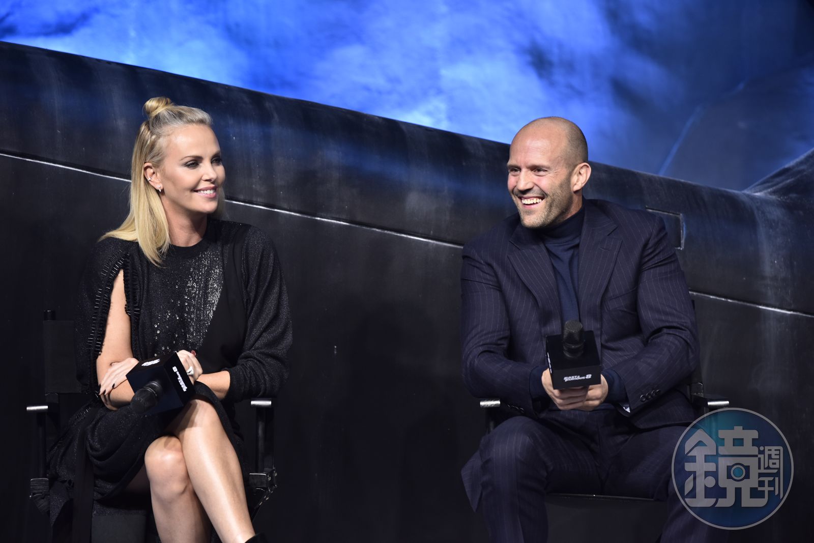 只是相親相愛的場面話說完了,莎莉賽隆接下來就繼續逗傑森史塔森,一直拿兩人在戲中的敵對關係開玩笑。當傑森史塔森被問到,拍攝《玩命關頭8》最大的困難是什麼,莎莉賽隆在一旁搶話說:「就是我!」傑森只能接話:「沒錯,她就像是一個自行治理的國家。」等到莎莉賽隆被問到,是否會在往後的《玩命關頭》亮相?她先是很謙虛地說,要看觀眾的反應才能決定,接下來話峰一轉,又拿傑森史塔森開刀,「但是我可以跟你保證,他才不會像戴克蕭那樣變成好人。」一直在諷刺傑森史塔森從上一集的反派,到了這一集變成好人。