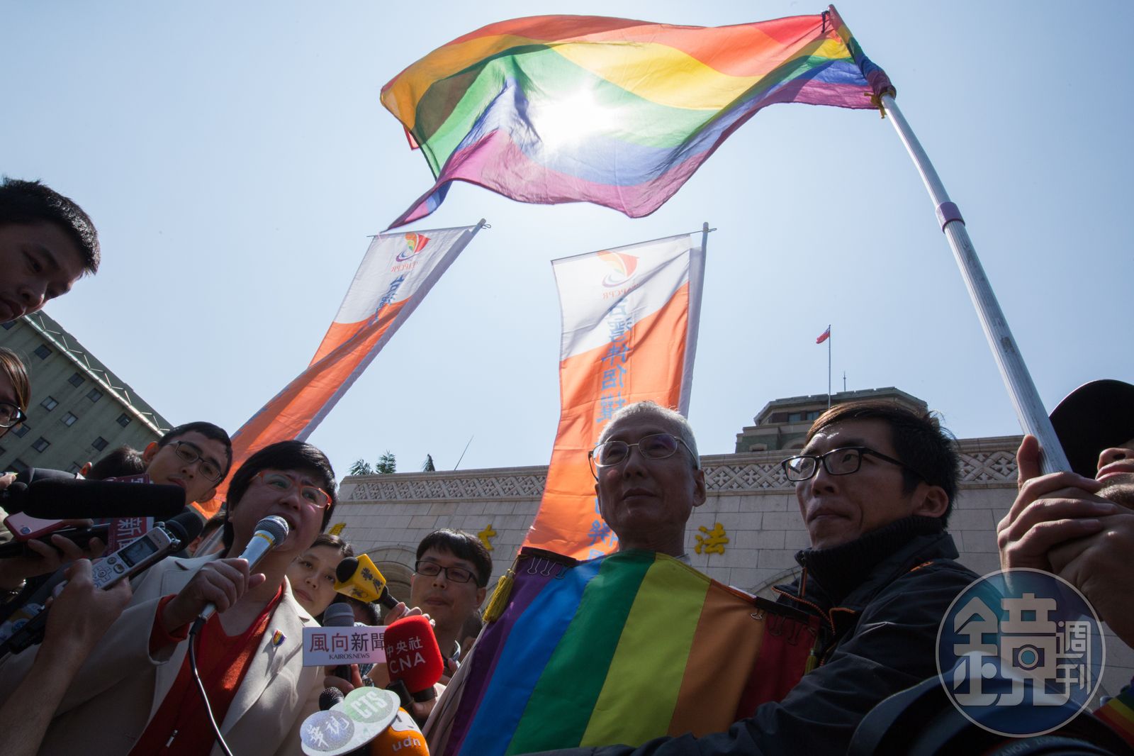 祁家威第一次來到司法院,披著彩虹戰袍為同志發聲。