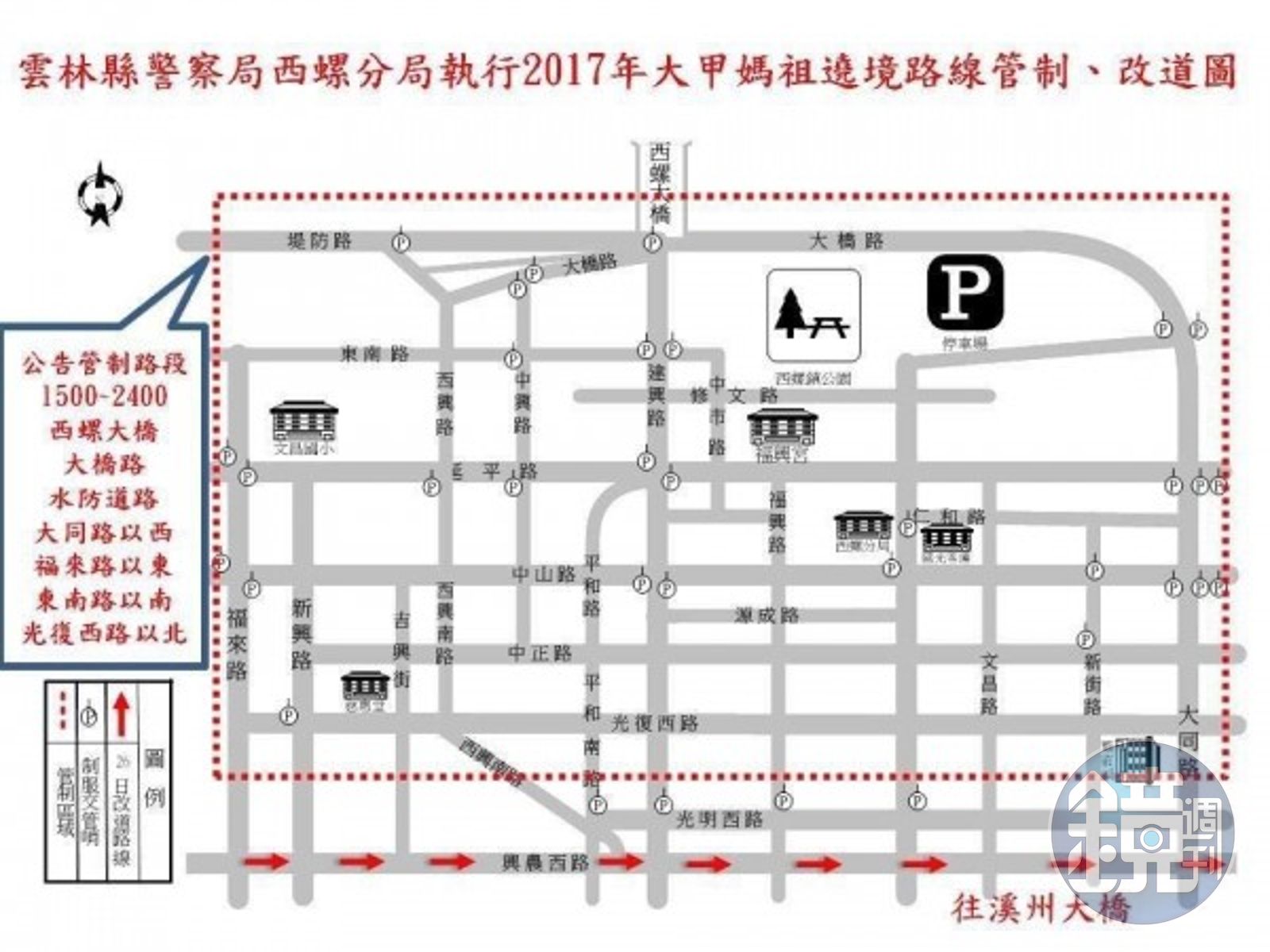 為了維護遶境隊伍的安全,避免交通堵塞,雲林縣警局24日宣布:26日下午3點到晚上12點西螺大橋及遶境沿線周邊道路將實施交通管制,除機踏車、當地住戶車輛可通行外,禁止其他車輛進出。