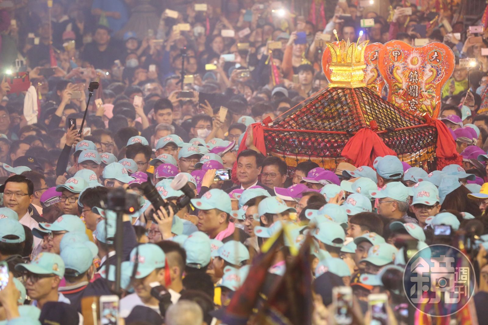 蘇嘉全、林佳龍與顏清標3名重量級的政治大咖扶著鑾轎緩慢步下鎮瀾宮丹墀,卻因為熱情信徒擠得水泄不通,慢慢朝南遶境,廟方表示,媽祖鑾轎預計凌晨會行至大甲溪橋北端,屆時會施放百萬煙火,而數萬信徒跟著鑾轎,使得台一線南北向到了凌晨還是寸步難行。