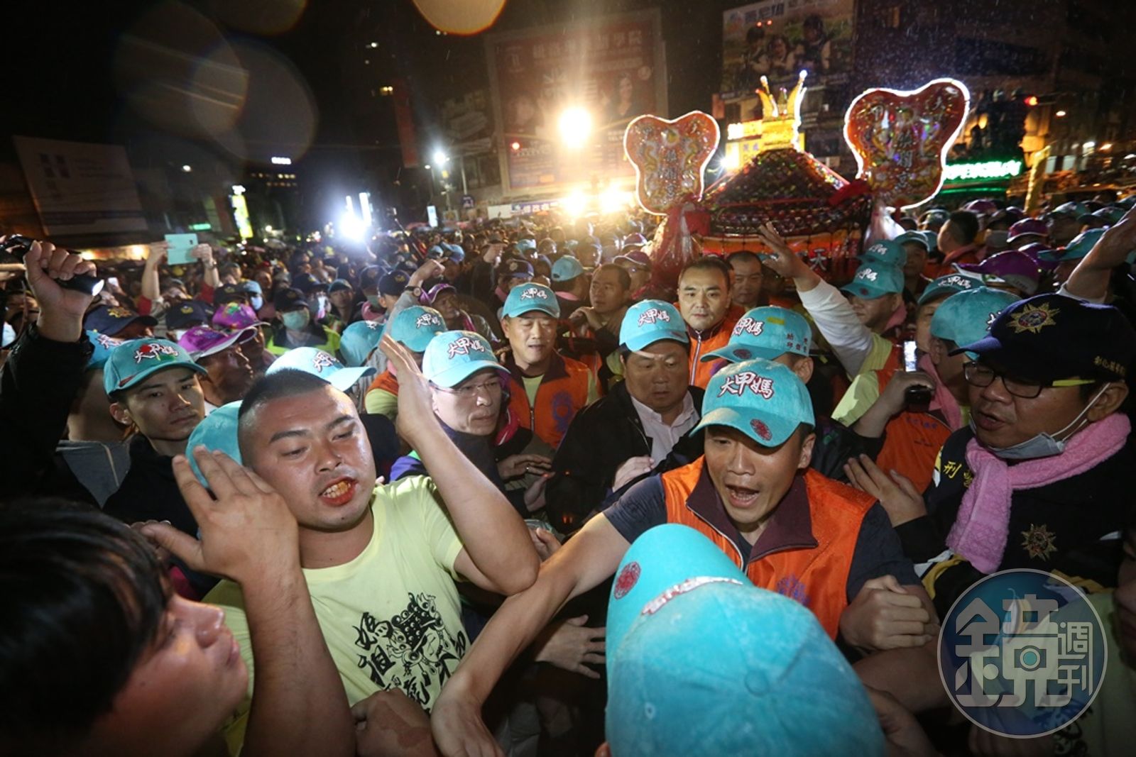 數千人的隊伍迅速通過地下道,西線無戰事!眼尖的民眾赫然發現,鎮瀾宮董事長「標哥」顏清標一夫當關,手扶轎槓昂首顧盼。