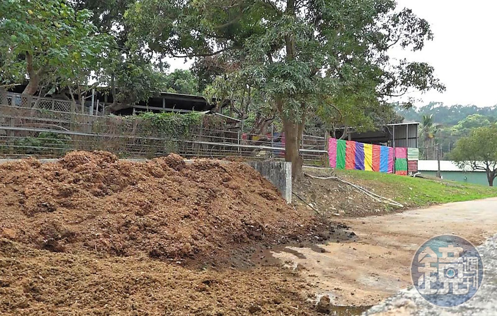 陳先生沿著鳳梨田旁的小路,帶領記者到會被糞水淹沒的街道,現場還殘留著上次下雨天留下的糞便痕跡。陳先生在路旁蹲下用手筆畫「旁邊這些都是乾掉的牛糞,每次下大雨,每次都會淹,臭味真的讓人受不了。」