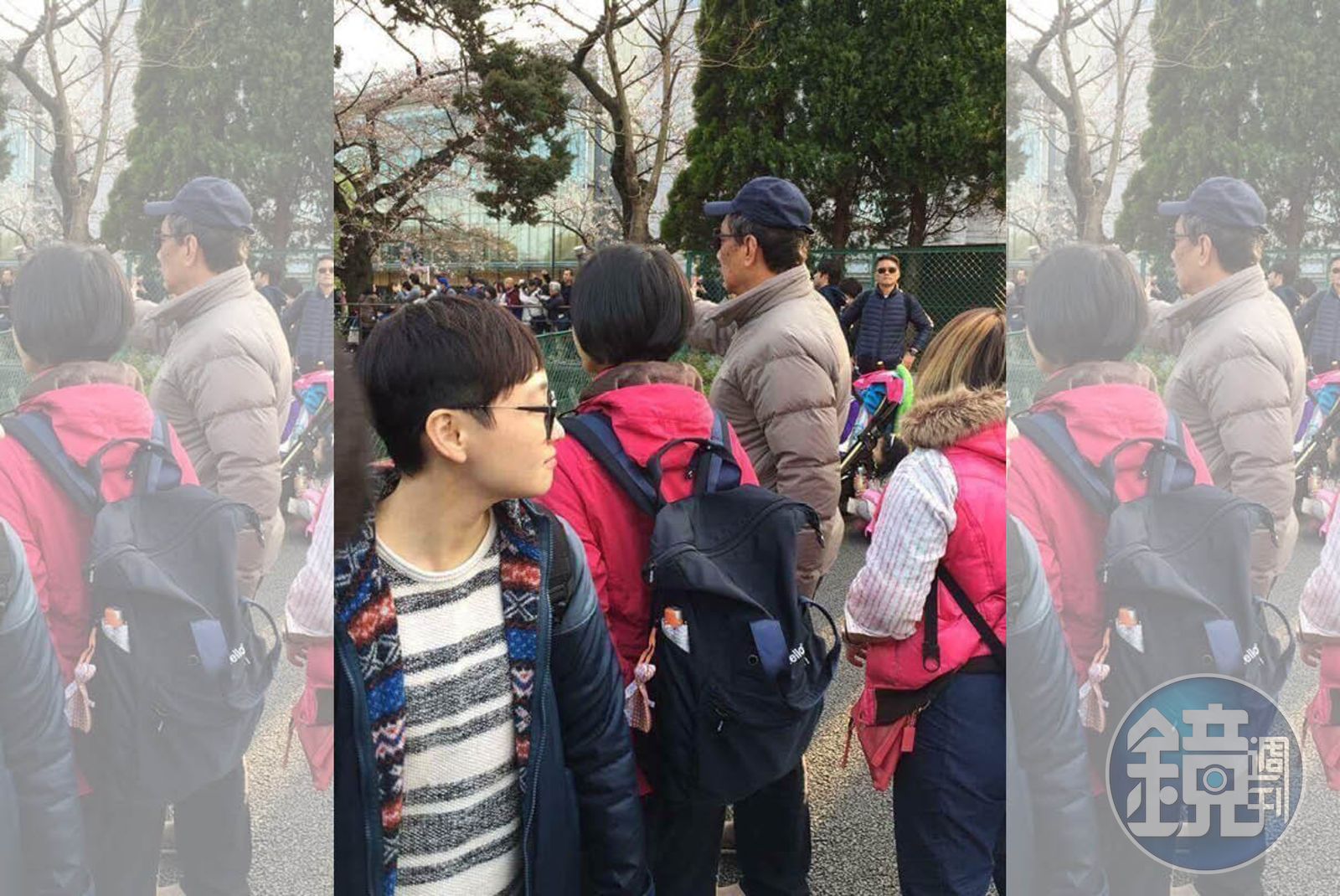 照片中看見郭董穿著卡其色的羽絨外套,帶著藍色球帽,拿著手機拍下櫻花美景。另一張照片則看到夫人曾馨瑩則穿著藍色羽絨外套頭戴毛帽,背對著美麗的櫻花林自拍,女兒妞妞則緊緊抱著曾馨瑩撒嬌。