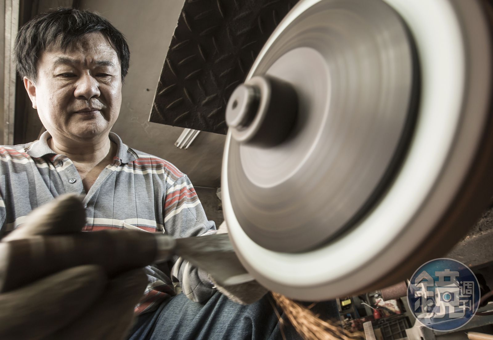 此外,王叔明也親自設計盾牌造型的店徽,烙印在每一把日日用的刀具上,「我老爸想,反正大家都不知道我在這裡,乾脆主動出擊拿去寄賣,刀具上面都有我們的mark跟電話。」